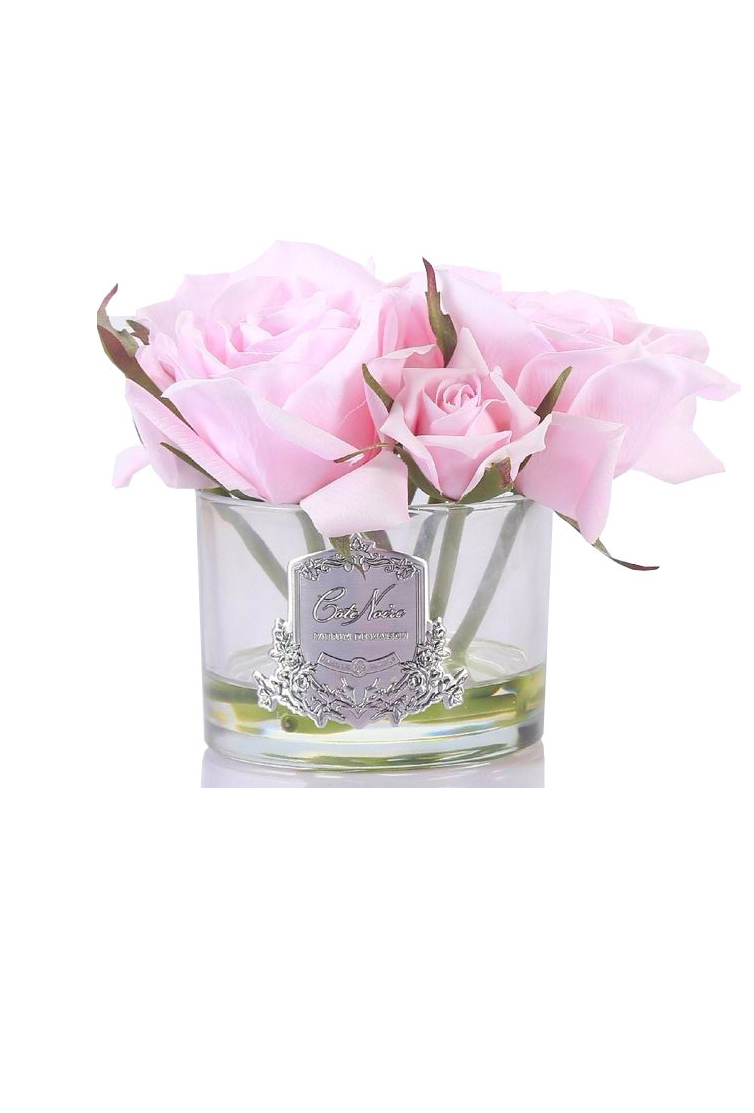 Букет ароматизированный из 5 роз "COTE NOIRE" (розовый) прозрачная ваза, 2 спрея по 5 мл