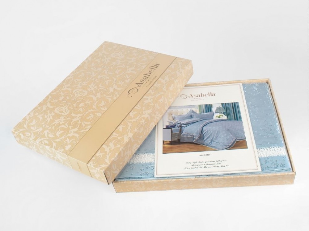 Постельное бельё из жаккардового люкс сатина с пододеяльником на молнии и наволочками с клапаном — наиболее обширная коллекция постельного белья торговой марки «Asabella». Верх пододеяльника и наволочек выполнен из жаккардового люкс-сатина (55% вискоза, 45% хлопок), а простыня, внутренняя сторона пододеяльника и наволочек из люкс-сатина (100% хлопок). Добавление вискозного волокна к волокнам хлопка улучшает стойкость красок к воздействию внешних факторов, увеличивает гигроскопичность изделия и существенно снижает его вес.