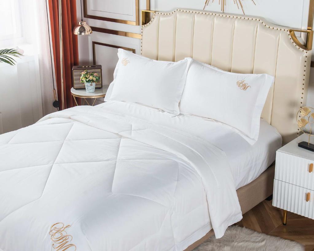 По сравнению с обычным сатином люксовый аналог обладает более высокой степенью скрученности волокон, что определяет его повышенную прочность и износостойкость и особый «шёлковый» блеск, но в отличие от шёлка он не скользит и практически не мнётся. Вместо стандартного пододеяльника в комплект входит одеяло с наполнителем из микро(нано) волокна.
