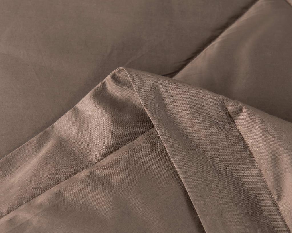 По сравнению с обычным сатином люксовый аналог обладает более высокой степенью скрученности волокон, что определяет его повышенную прочность и износостойкость и особый «шёлковый» блеск, но в отличие от шёлка он не скользит и практически не мнётся. Вместо стандартного пододеяльника в комплект входит одеяло с наполнителем из микро(нано) волокна.