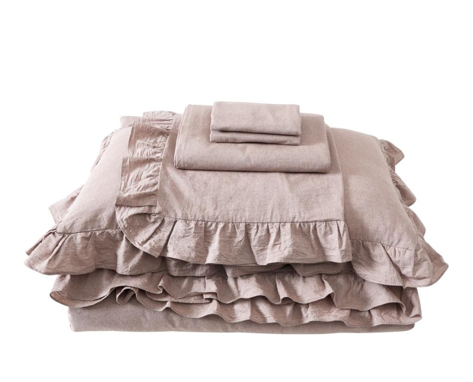 Постельное бельё с рюшами серии VJ торговой марки "Karteks", выполненное из "варёного хлопка", отличается лёгким жатым эффектом, повышенной плотностью, износостойкостью, воздухопроницаемостью, выдерживает многочисленные стирки.