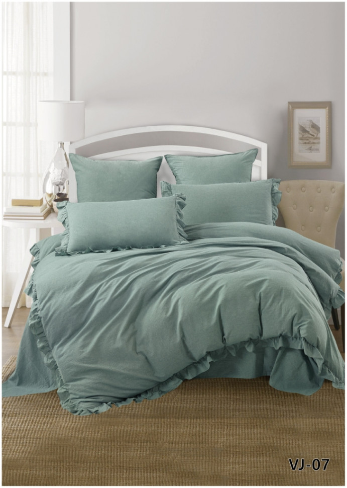 Постельное бельё с рюшами серии VJ торговой марки "Karteks", выполненное из "варёного хлопка", отличается лёгким жатым эффектом, повышенной плотностью, износостойкостью, воздухопроницаемостью, выдерживает многочисленные стирки.
