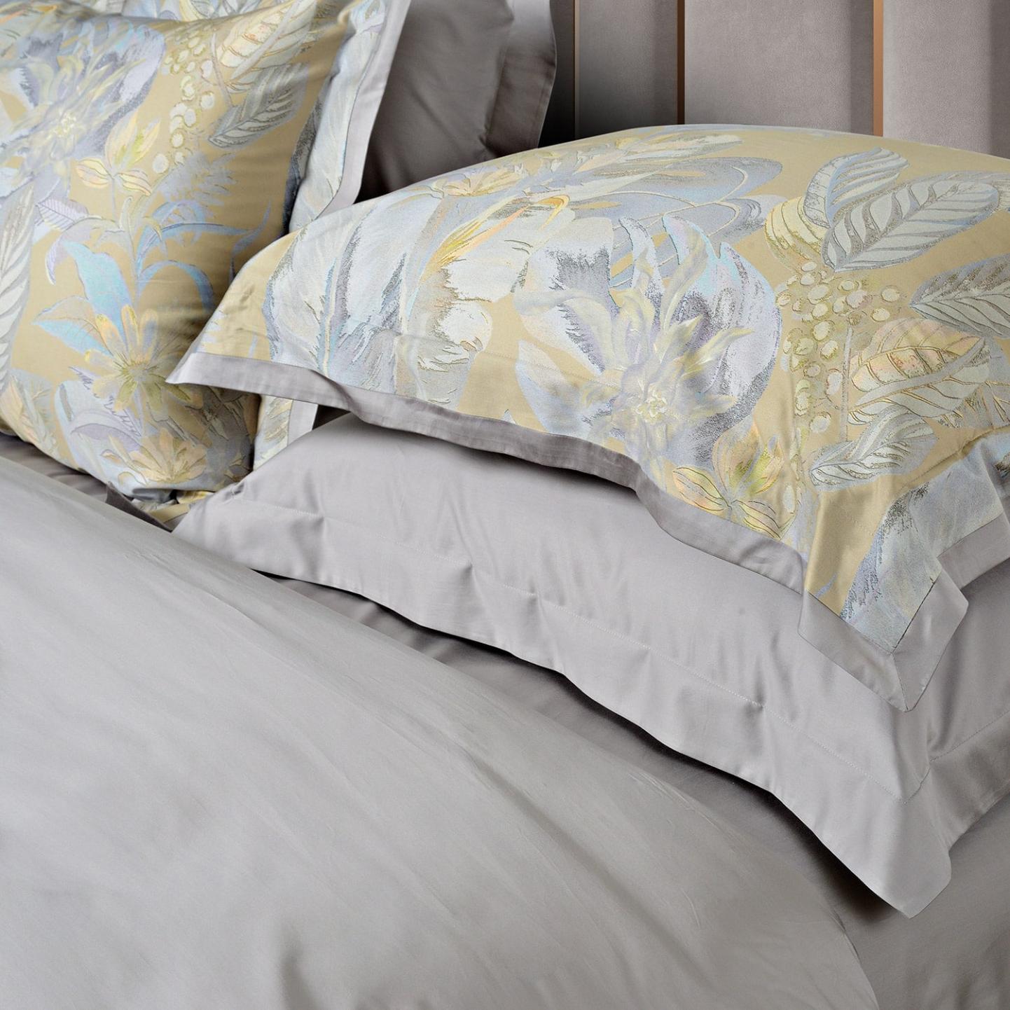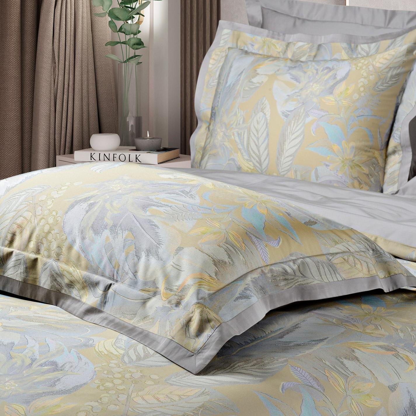 Наволочки с запахом (клапан) отшиты в дизайне «Оксфорд» с ушками шириной 5 см. Пододеяльник с застёжкой на пуговицах, спрятанными в потайной клапан, выполнен с «ушками» по 5 см с трех сторон.