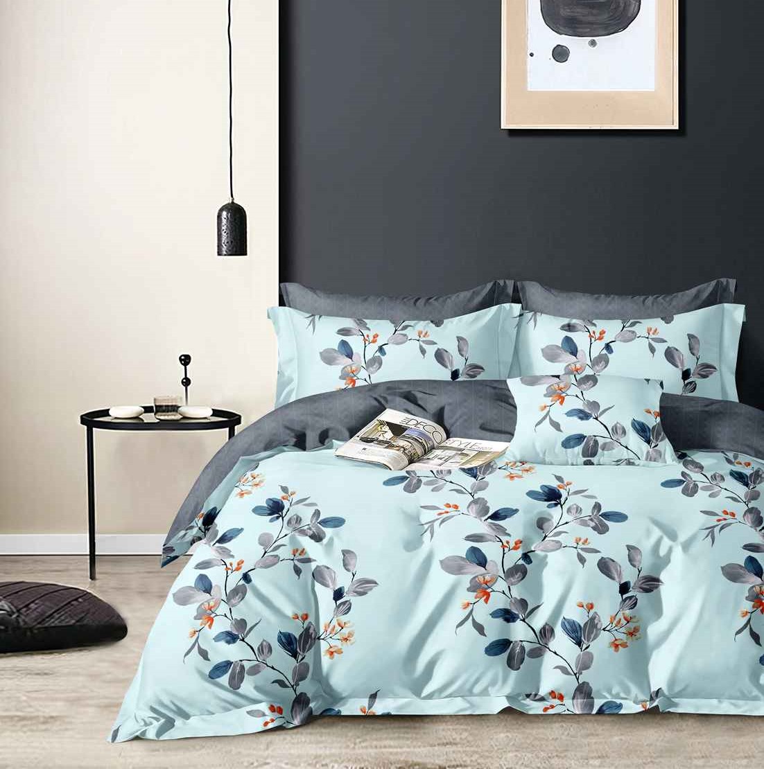 Комплекты выполнены из основной ткани - наружная поверхность пододеяльника и наволочек, и ткани компаньона - простыня, обратная сторона пододеяльника и наволочек.