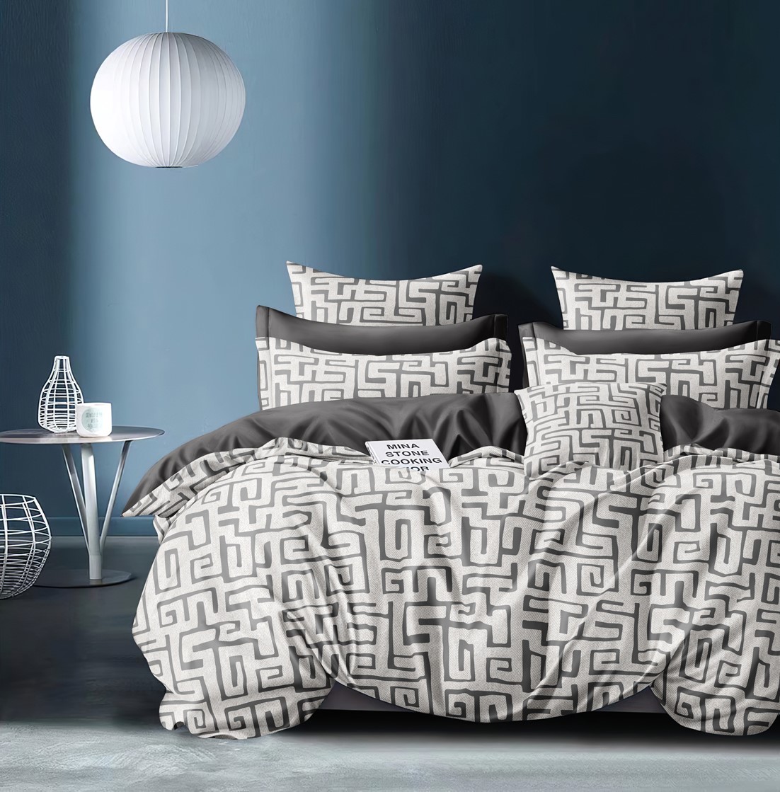 Комплекты выполнены из основной ткани - наружная поверхность пододеяльника и наволочек, и ткани компаньона - простыня, обратная сторона пододеяльника и наволочек.