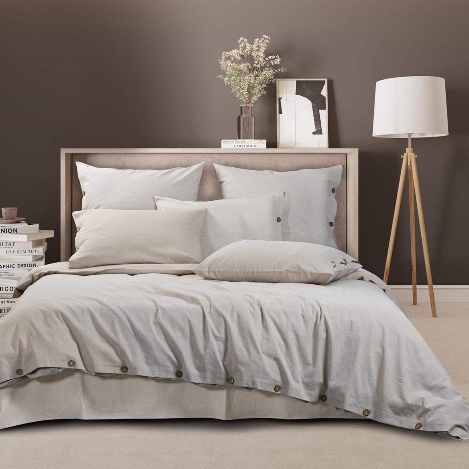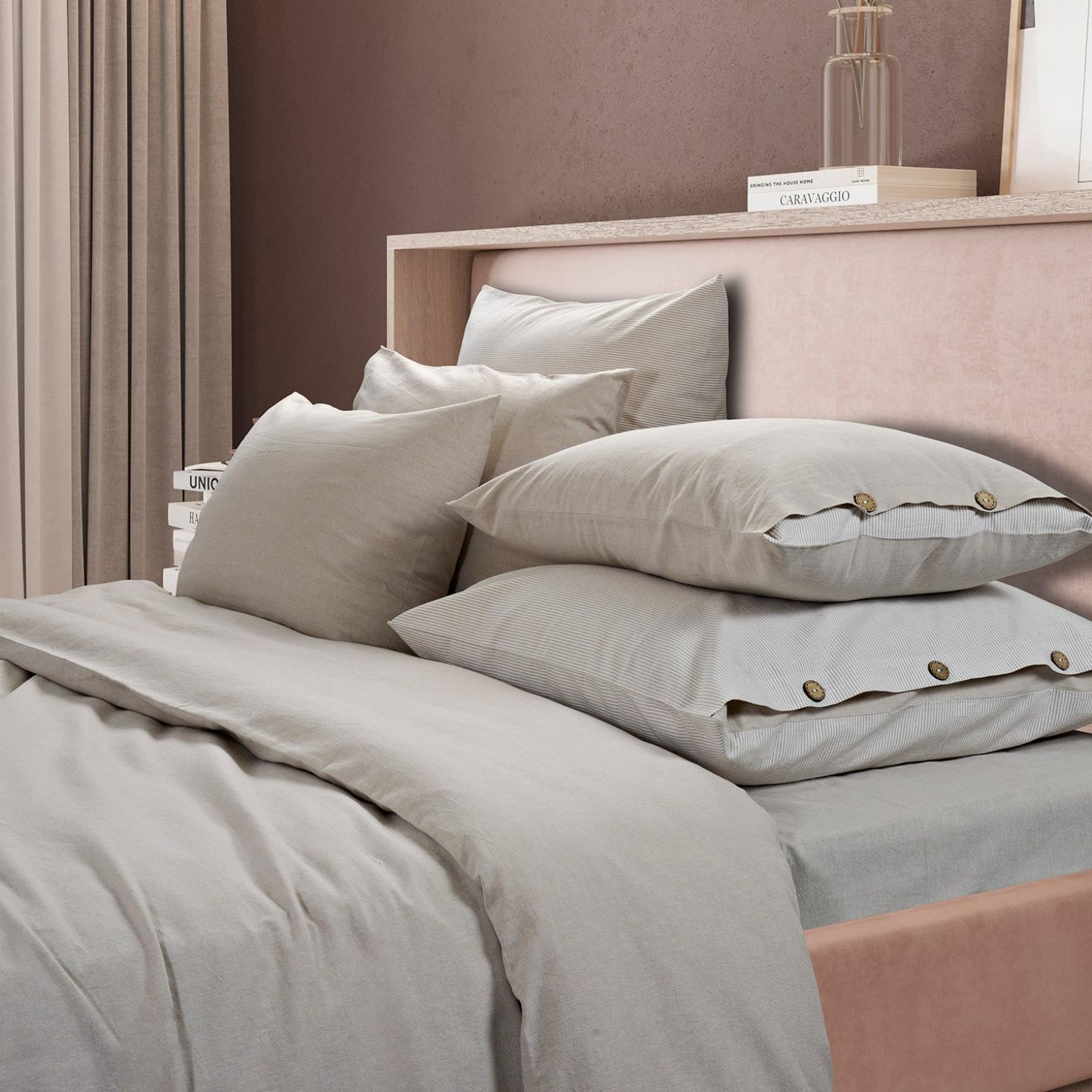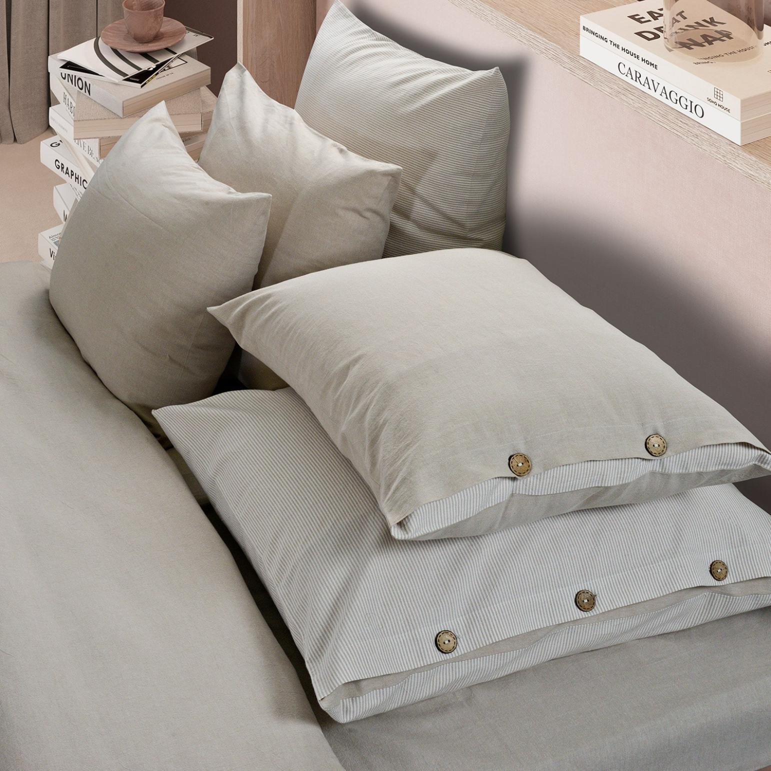 Постельное бельё "Rustic melange" торговой марки "Sharmes", выполненное из "варёного хлопка", отличается лёгким жатым эффектом, повышенной плотностью, износостойкостью, воздухопроницаемостью, выдерживает многочисленные стирки. Застёжка наволочек и пододеяльника - кокосовые пуговицы.
