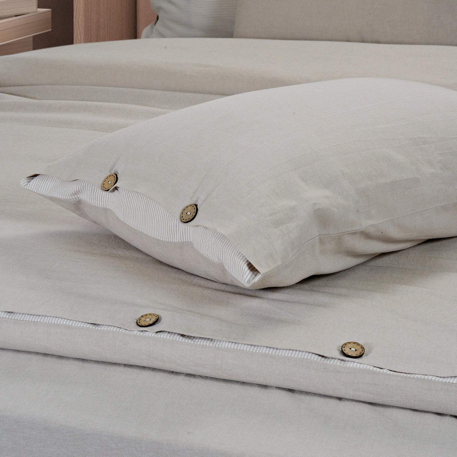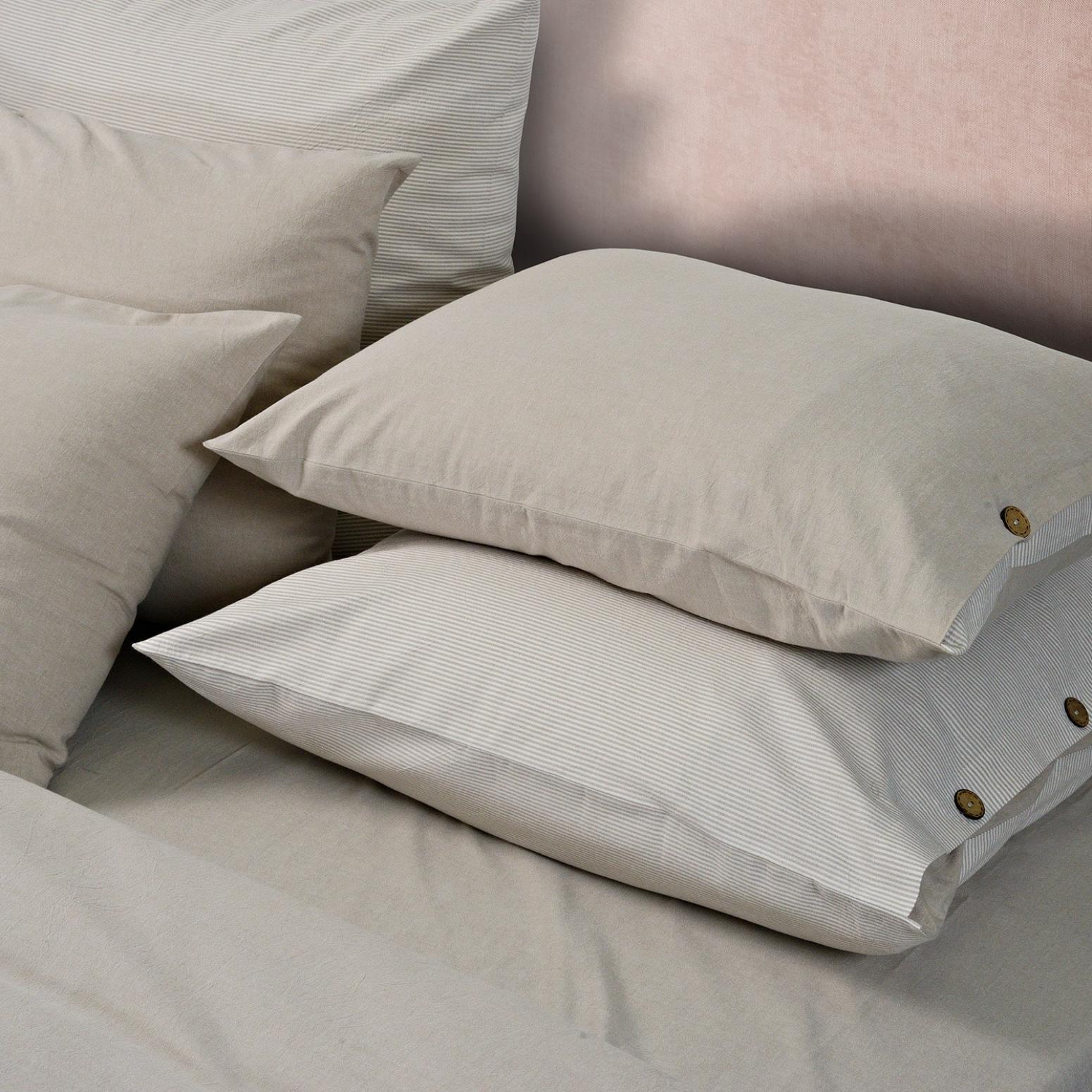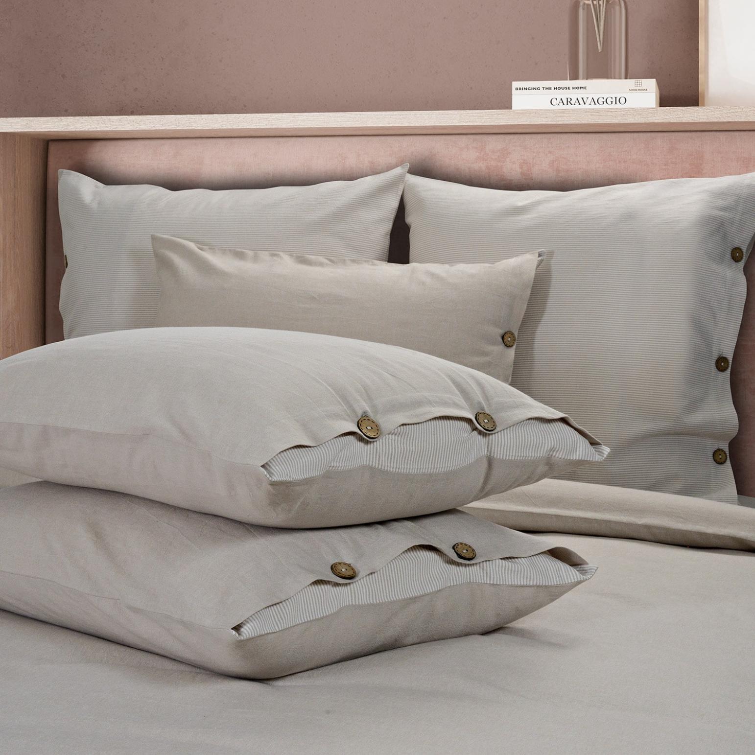 Постельное бельё "Rustic melange" торговой марки "Sharmes", выполненное из "варёного хлопка", отличается лёгким жатым эффектом, повышенной плотностью, износостойкостью, воздухопроницаемостью, выдерживает многочисленные стирки. Застёжка наволочек и пододеяльника - кокосовые пуговицы.