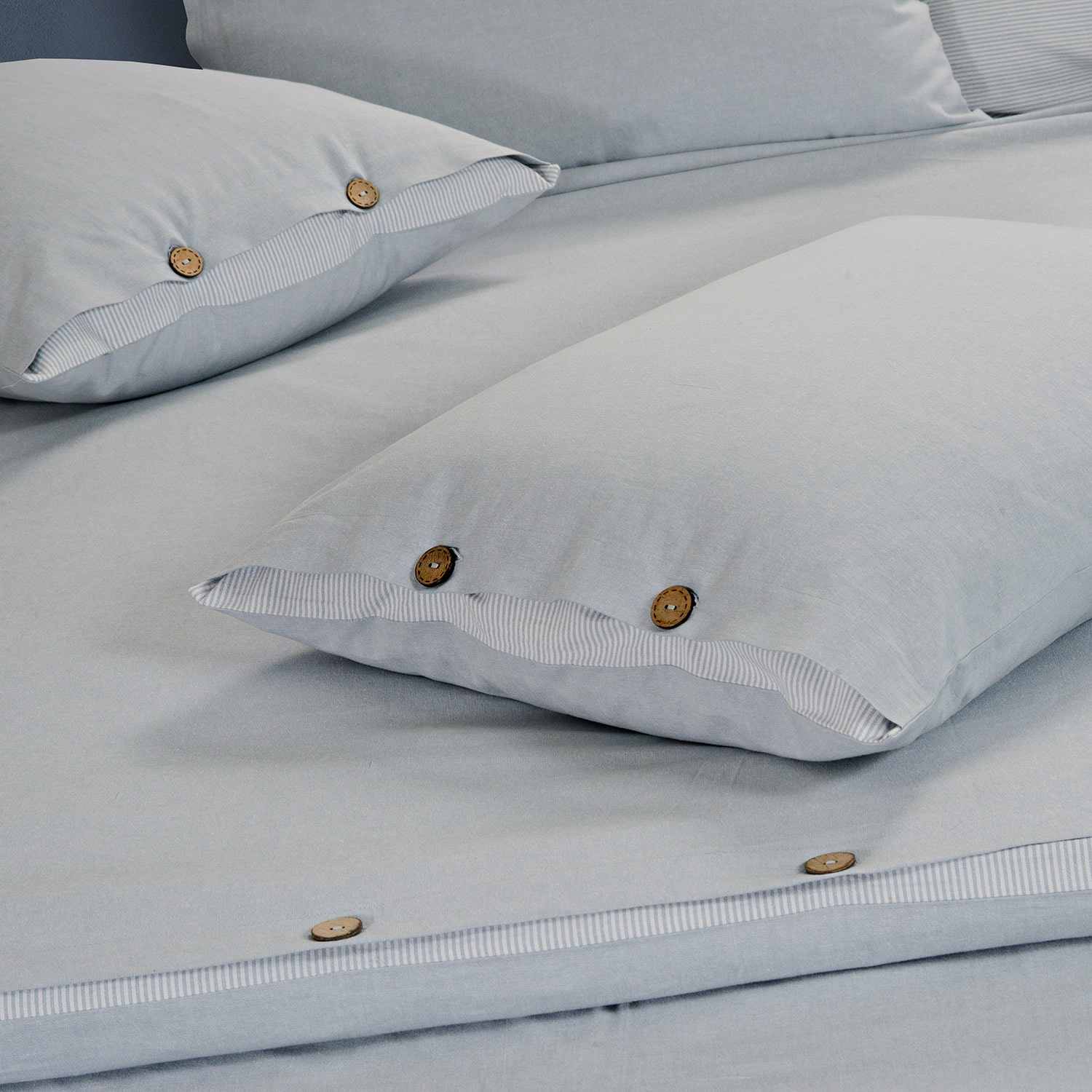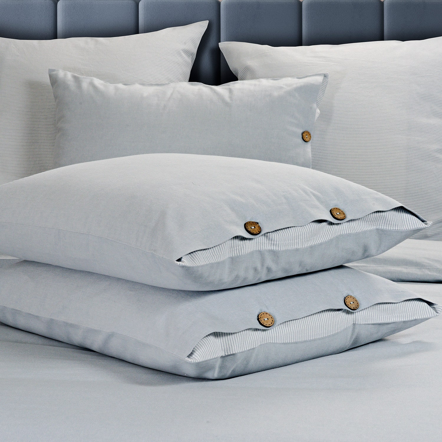 Постельное бельё "Rustic stripe" торговой марки "Sharmes", выполненное из "варёного хлопка", отличается лёгким жатым эффектом, повышенной плотностью, износостойкостью, воздухопроницаемостью, выдерживает многочисленные стирки. Пододеяльник и наволочки пошиты из 100% натурального жаккарда в мелкую полоску, простынь - однотонная. Застёжка наволочек и пододеяльника - кокосовые пуговицы.