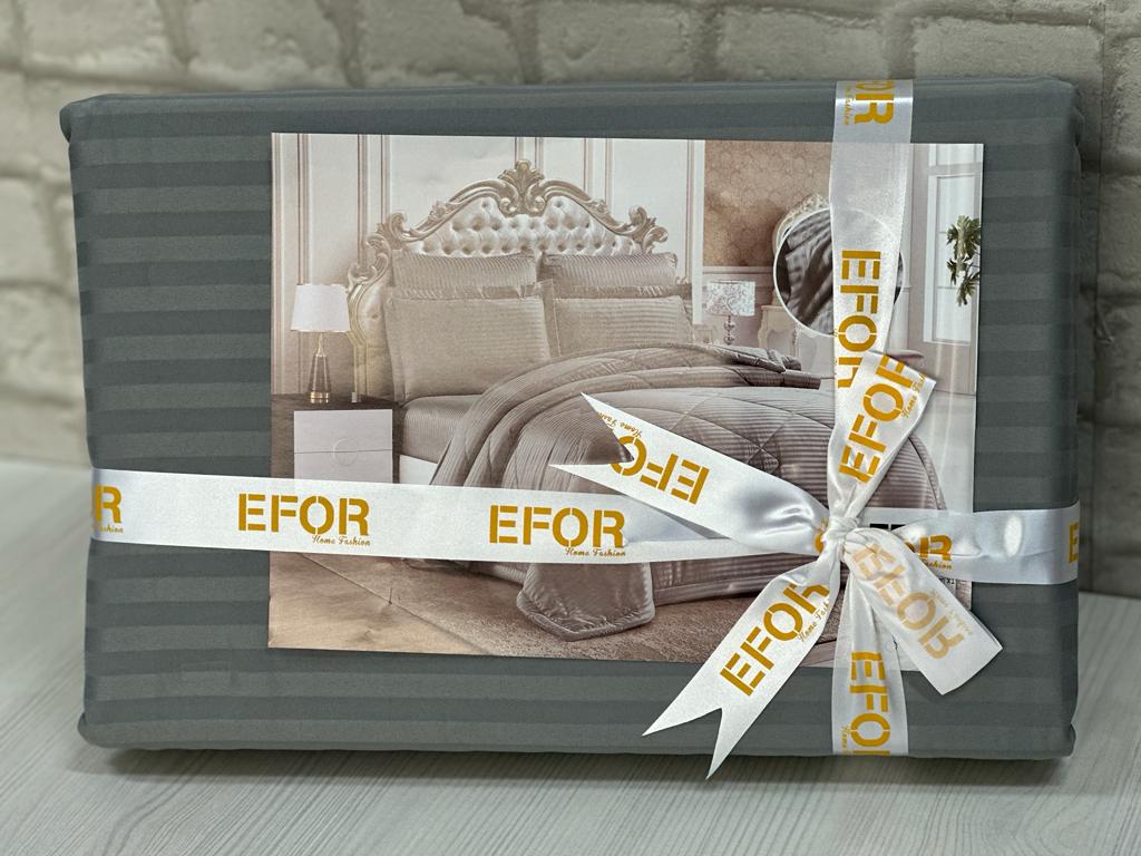 Постельное бельё данной серии торговой марки «EFOR» выполнено из страйп-сатина на основе смеси волокон хлопка и полиэстера. Страйп-сатин - представляет собой удачное сочетание сатина и жаккарда. Основа материала выполнена из сатина, а полосы той же тональности в жаккардовом переплетении волокон. Помимо эстетической составляющей для постельного белья из страйп-сатина характерны очень высокий уровень прочности и износостойкости. Вместо стандартного пододеяльника в комплект входит лёгкое одеяло с наполнителем из микроволокна.