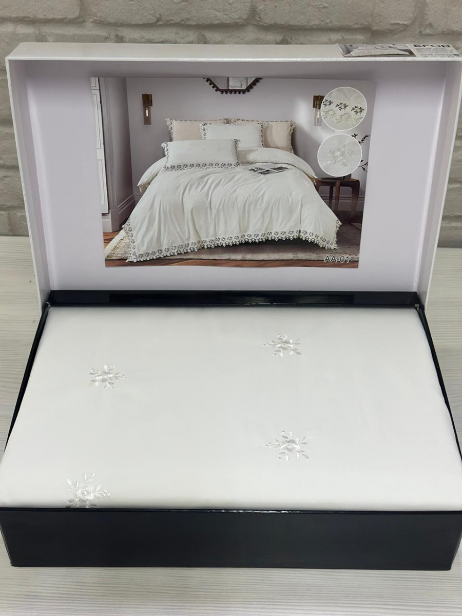 Постельное бельё серии "COTTONI" с гипюром торговой марки «EFOR» выполнено из хлопка с добавлением волокон вискозы и эластана. Многократное переплетение хлопковых волокон двойного кручения обеспечивает комплектам гладкость и шелковистость, прочность и износостойкость. В качестве ухода рекомендована стирка при температуре 40 °C.