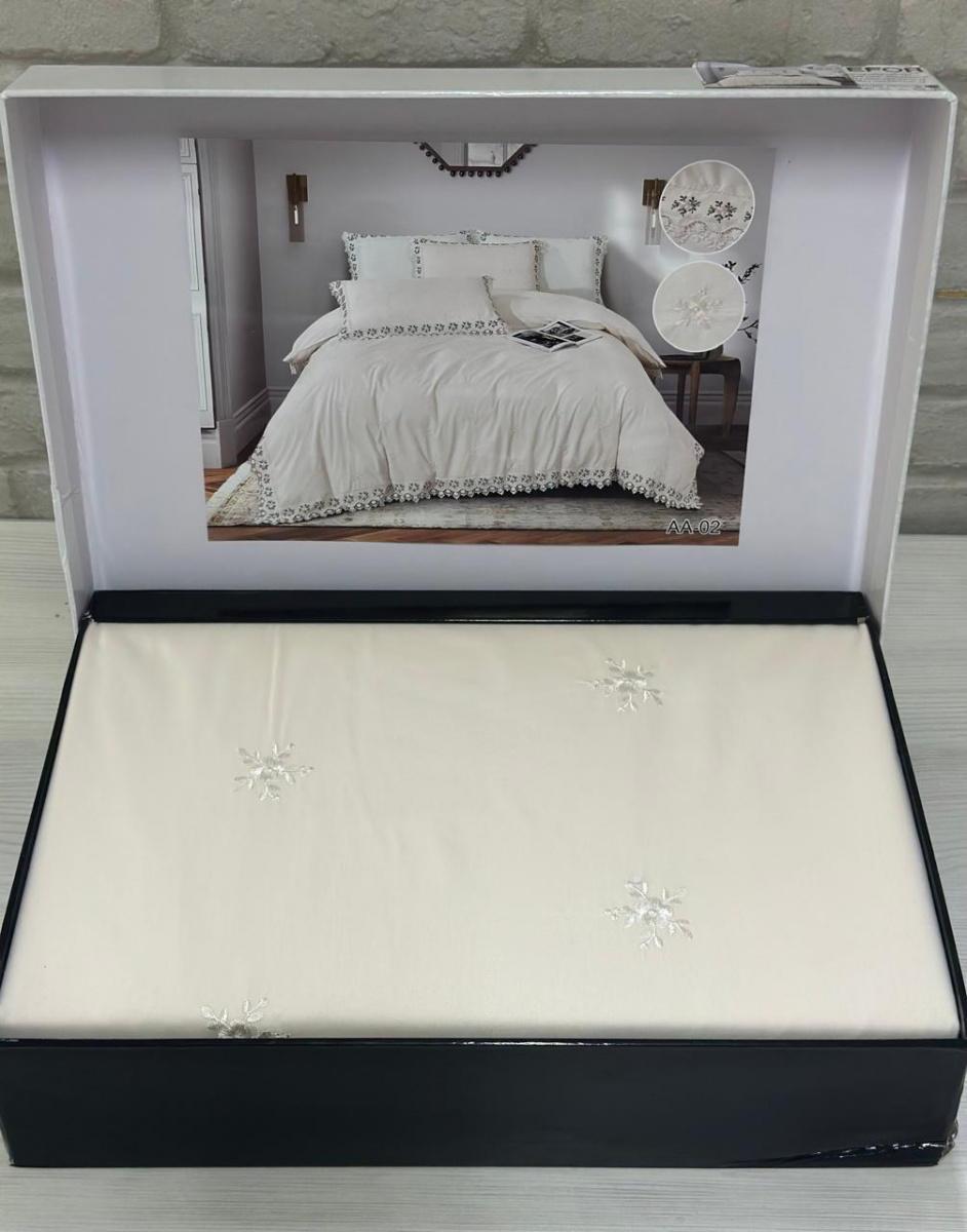 Постельное бельё серии "COTTONI" с гипюром торговой марки «EFOR» выполнено из хлопка с добавлением волокон вискозы и эластана. Многократное переплетение хлопковых волокон двойного кручения обеспечивает комплектам гладкость и шелковистость, прочность и износостойкость. В качестве ухода рекомендована стирка при температуре 40 °C.
