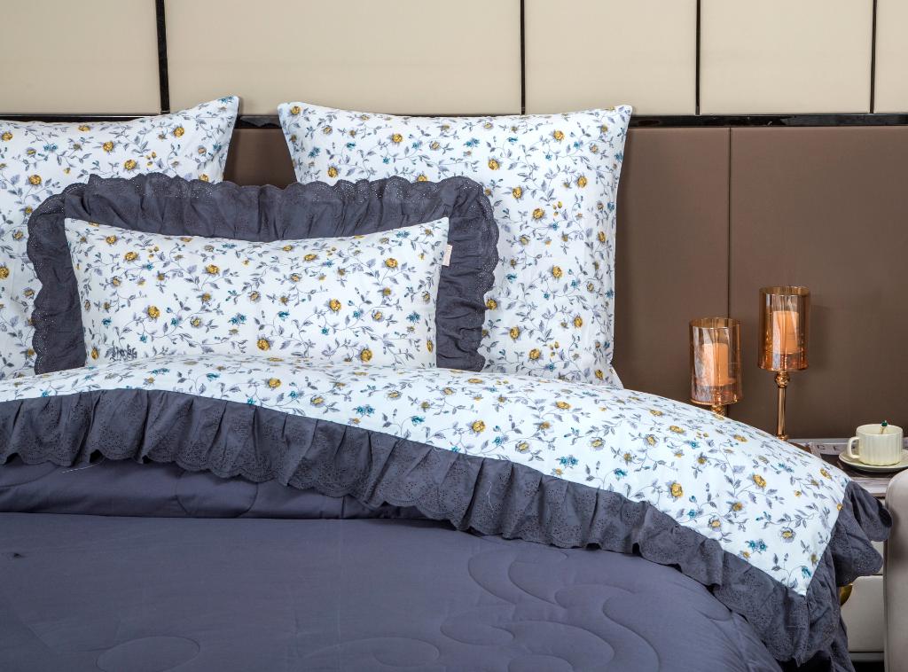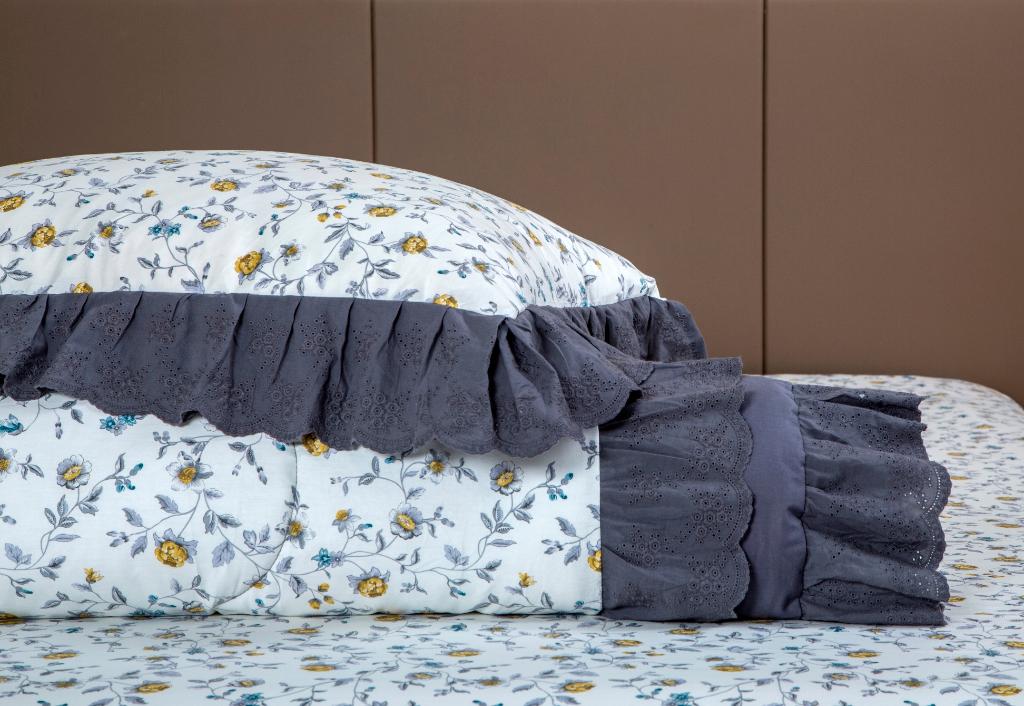 Коллекция "Corsica Village" представляет собой комбинацию постельного белья и лёгкого одеяла в чехле. В качестве наполнителя одеяла используется эковолокно-микрогель. Наволочки, простыня и чехол одеяла выполнены из сатина (100% хлопок). Изделие неприхотливо в уходе, легко стирается и быстро высыхает. Наволочки и чехол одеяла декорированы воланами из утончённого батиста.