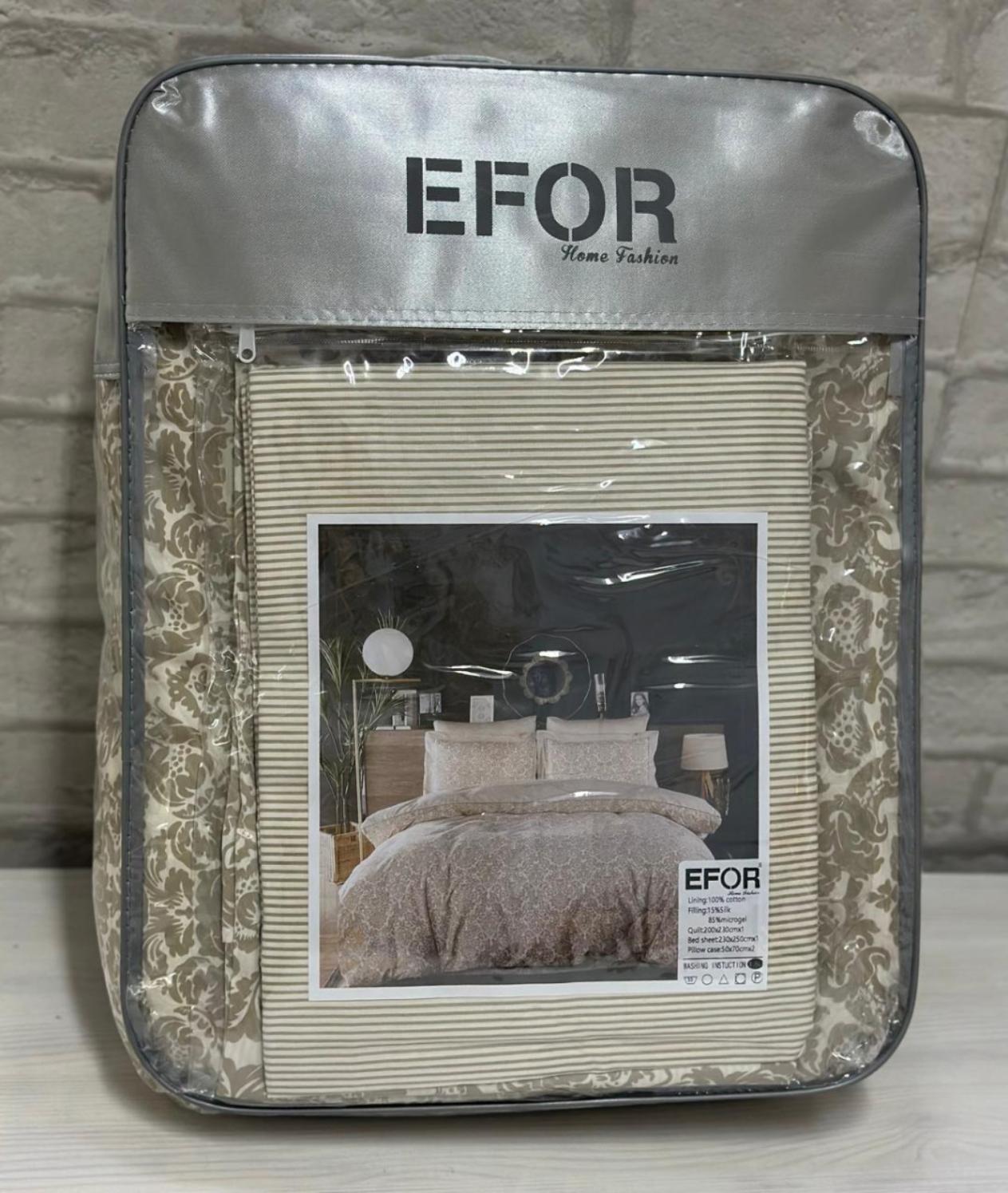 Постельное бельё серии "COTTONI" торговой марки «EFOR» выполнено из хлопка с добавлением волокон вискозы и эластана. Многократное переплетение хлопковых волокон двойного кручения обеспечивает комплектам гладкость и шелковистость, прочность и износостойкость. Вместо пододеяльника в комплект входит одеяло с наполнителем из смеси волокон микрогеля и шёлка. В качестве ухода рекомендована стирка при температуре 40 °C.