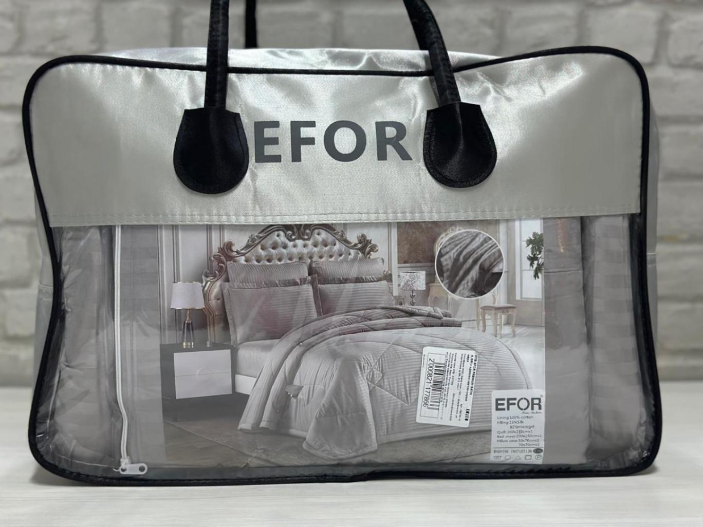 Постельное бельё с одеялом серии PREMIUM торговой марки «EFOR» выполнено из страйп-сатина на основе смеси волокон хлопка и полиэстера. Страйп-сатин - представляет собой удачное сочетание сатина и жаккарда. Основа материала выполнена из сатина, а полосы той же тональности в жаккардовом переплетении волокон. Помимо эстетической составляющей для постельного белья из страйп-сатина характерны очень высокий уровень прочности и износостойкости. Вместо пододеяльника в комплект входит одеяло с наполнителем из смеси волокон микрогеля и шёлка. В качестве ухода рекомендована стирка при температуре 40 °C.