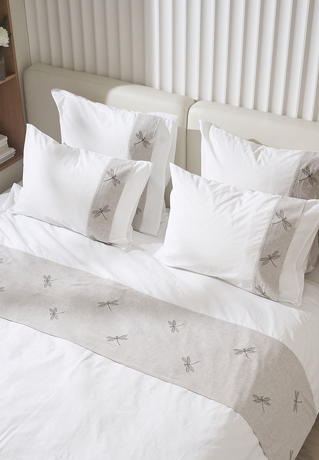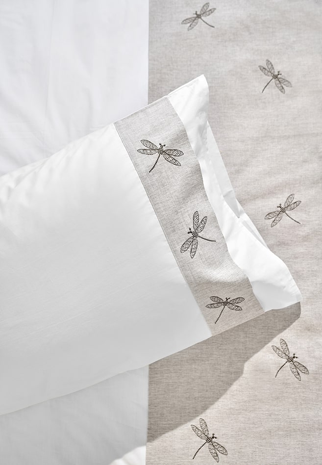 Комплекты постельного белья "ВЕЧЕРНИЕ СТРЕКОЗЫ" ТМ "Luxberry" выполнены из перкали с матовым оттенком на основе хлопка высокого качества, волокна которого не скручивают, а склеивают (шлихтуют). В результате чего получается прочная, износостойкая, долговечная ткань. Постельное бельё из перкали, с одной стороны, прочное и практичное, а с другой - тонкое и нежное. В качестве отделки используется широкая полоса изо льна (stone washed) с вышивкой.