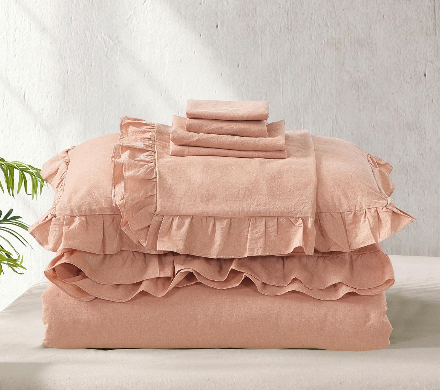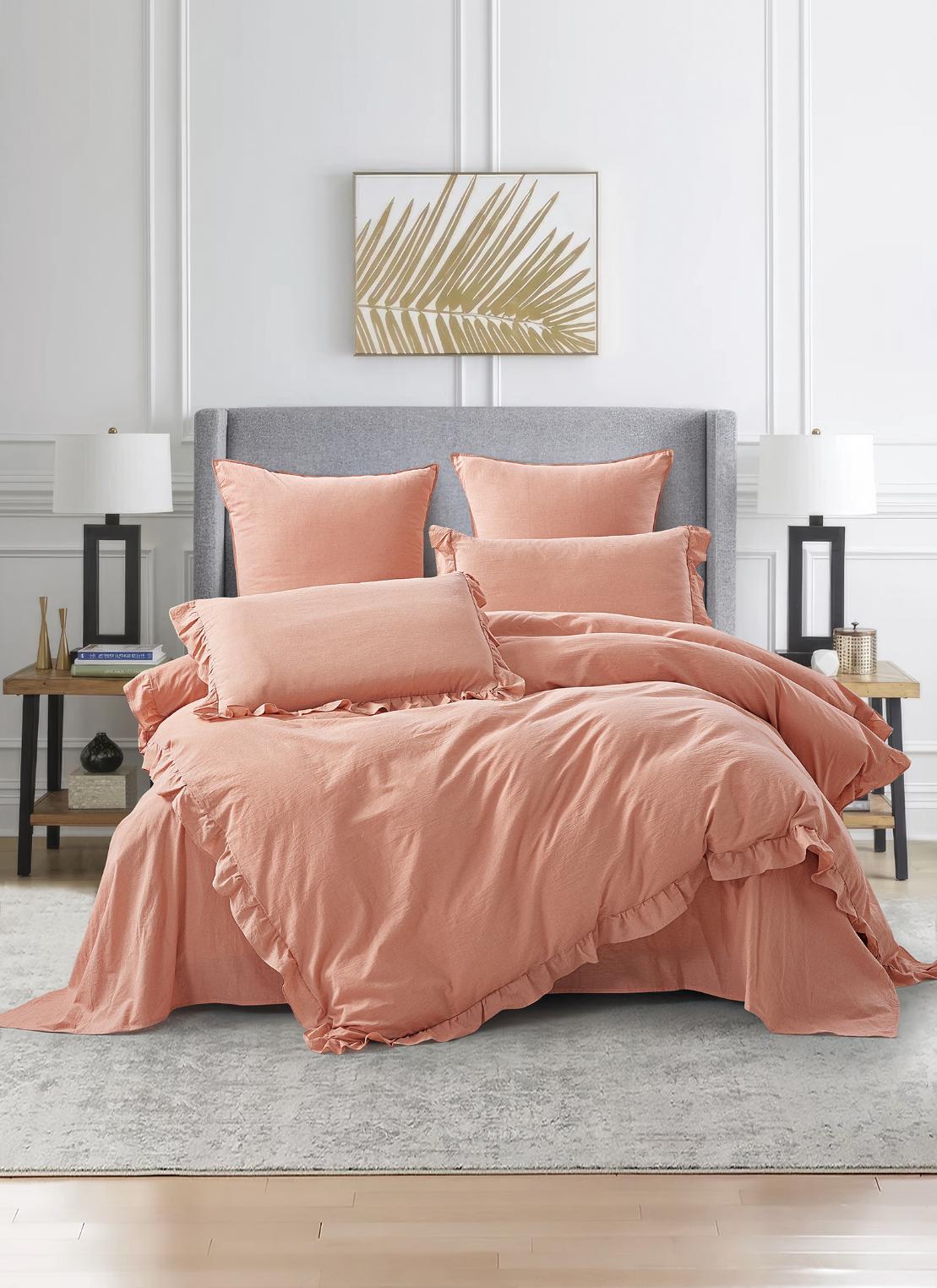 Постельное бельё с рюшами серии VJ торговой марки "Karteks", выполненное из "варёного хлопка", отличается лёгким жатым эффектом, повышенной плотностью, износостойкостью, воздухопроницаемостью, выдерживает многочисленные стирки.