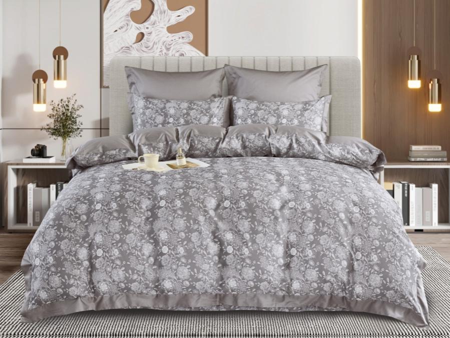 Верх пододеяльника и две наволочки 50x70 отделаны жаккардом с реактивной печатью. Простыня, низ пододеяльника и две наволочки 70x70 выполнены из 100% хлопка сатина.