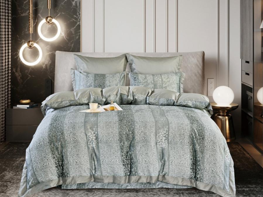 Верх пододеяльника и две наволочки 50x70 отделаны жаккардом с реактивной печатью. Простыня, низ пододеяльника и две наволочки 70x70 выполнены из 100% хлопка сатина.