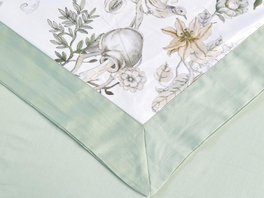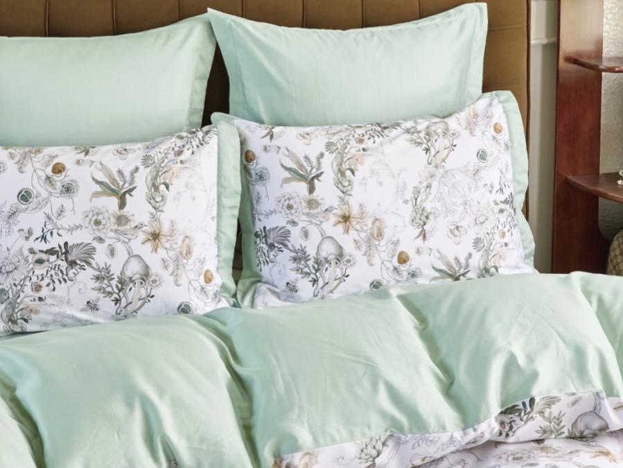 Верх пододеяльника и две наволочки 50x70 отделаны жаккардом с реактивной печатью. Простыня, низ пододеяльника и две наволочки 70x70 выполнены из 100% хлопка сатина.