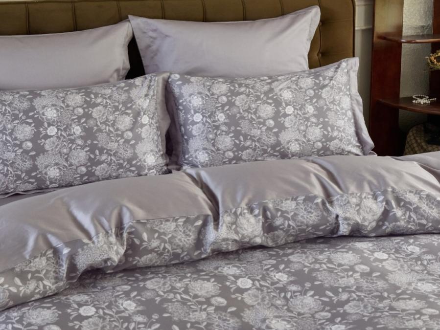 Верх пододеяльника и две наволочки 50x70 отделаны жаккардом с реактивной печатью. Простыня, низ пододеяльника и две наволочки 70x70 выполнены из 100% хлопка сатина.