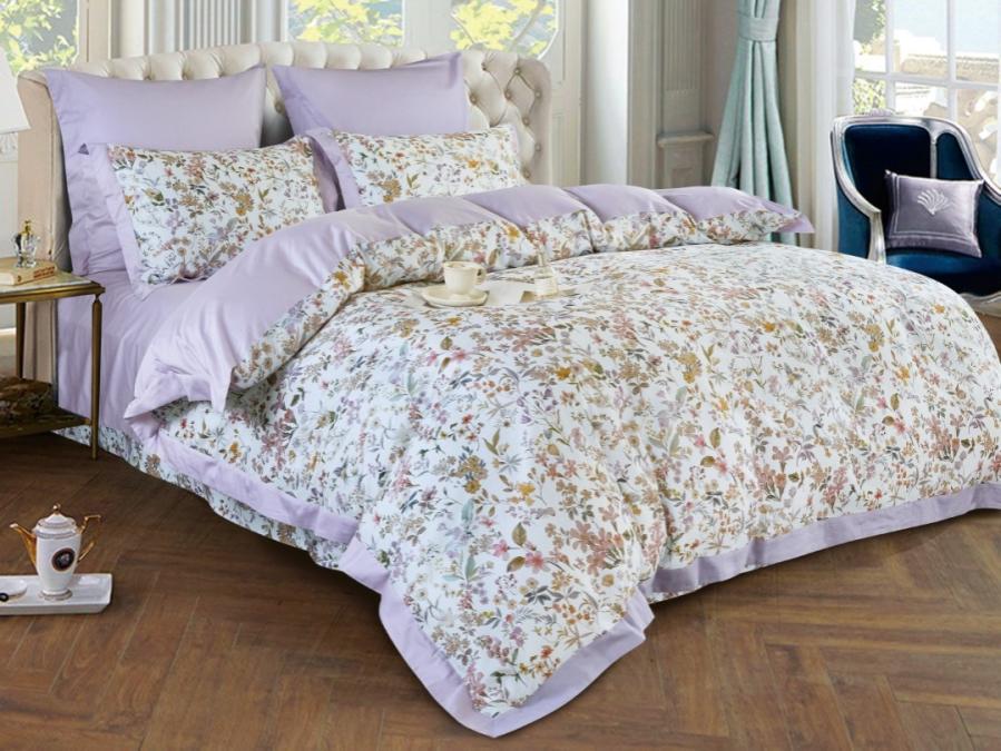 Верх пододеяльника и две наволочки 50x70 отделаны жаккардом с реактивной печатью. Простыня, низ пододеяльника и две наволочки 70x70 выполнены из 100% хлопка сатина.