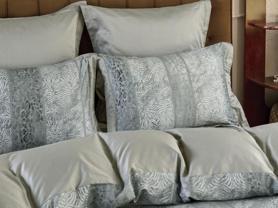 Верх пододеяльника и две наволочки 50x70 отделаны жаккардом с реактивной печатью. Простыня, низ пододеяльника и две наволочки 70x70 выполнены из 100% хлопка сатина.