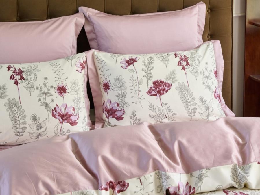 Верх пододеяльника и две наволочки 50x70 отделаны жаккардом с реактивной печатью. Простыня, низ пододеяльника и две наволочки 70x70 выполнены из 100% хлопка сатина.