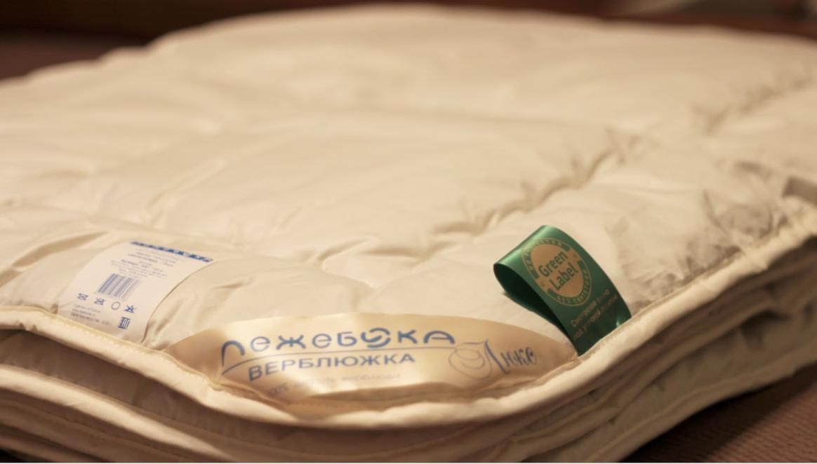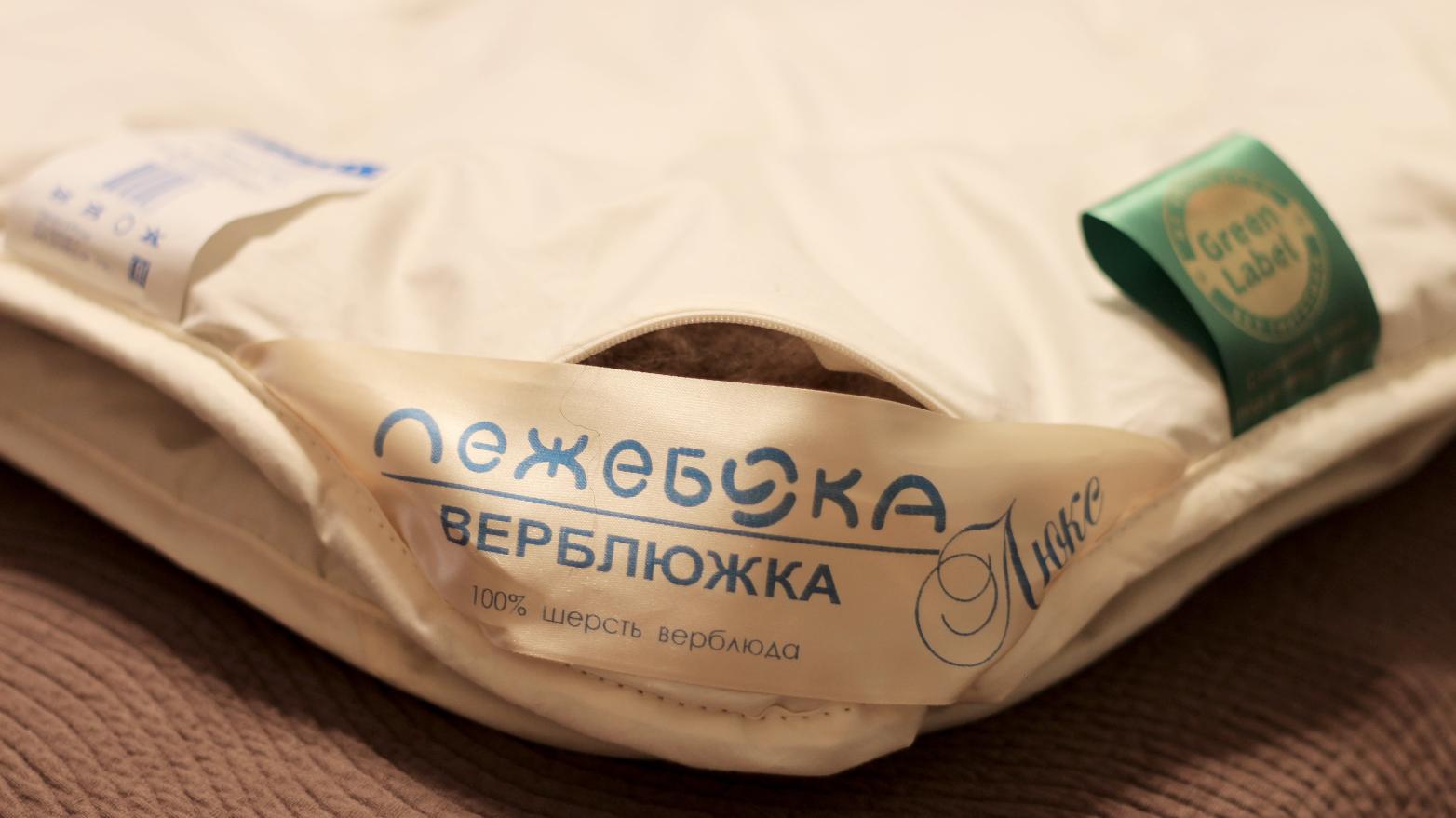 В качестве наполнителя для производства одеяла "Верблюжка Люкс" российской торговой марки "Лежебока" используется термоскреплённая верблюжья шерсть. Верблюжья шерсть содержит природный животный воск (ланолин), который при температуре человеческого тела впитывается через кожу, оказывая благотворное воздействие на мышцы и суставы. Полая структура волокон обеспечивает верблюжьему одеялу высокую теплоизоляцию, лёгкость и гигроскопичность. В одеяле есть смотровое окно на молнии под угловой лентой. Ткань чехла - 100% хлопок тик