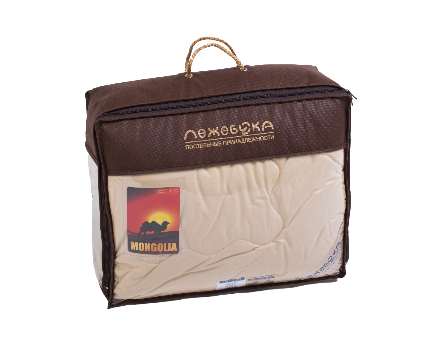 В качестве наполнителя для производства одеяла "Монголия" российской торговой марки "Лежебока" используется верблюжья шерсть, поставляемая из экологически чистых районов Монголии. Верблюжья шерсть содержит природный животный воск (ланолин), который при температуре человеческого тела впитывается через кожу, оказывая благотворное воздействие на мышцы и суставы. Полая структура волокон обеспечивает верблюжьему одеялу высокую теплоизоляцию, лёгкость и гигроскопичность. Ткань чехла - 100% хлопок твил пуходержащий.
