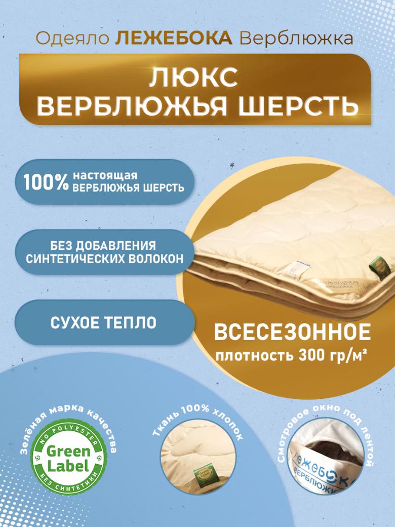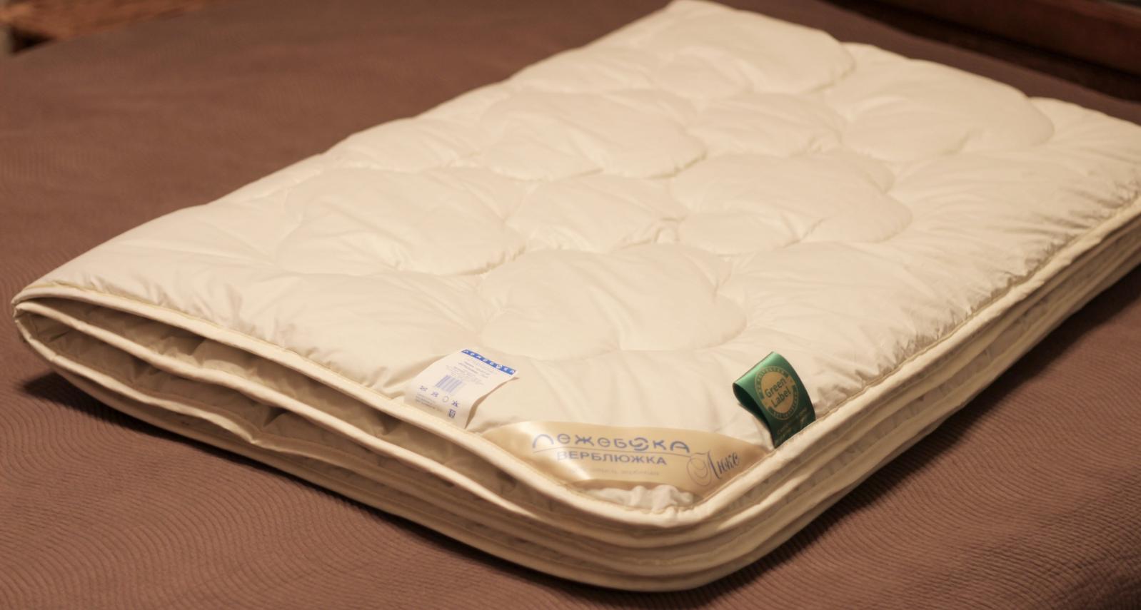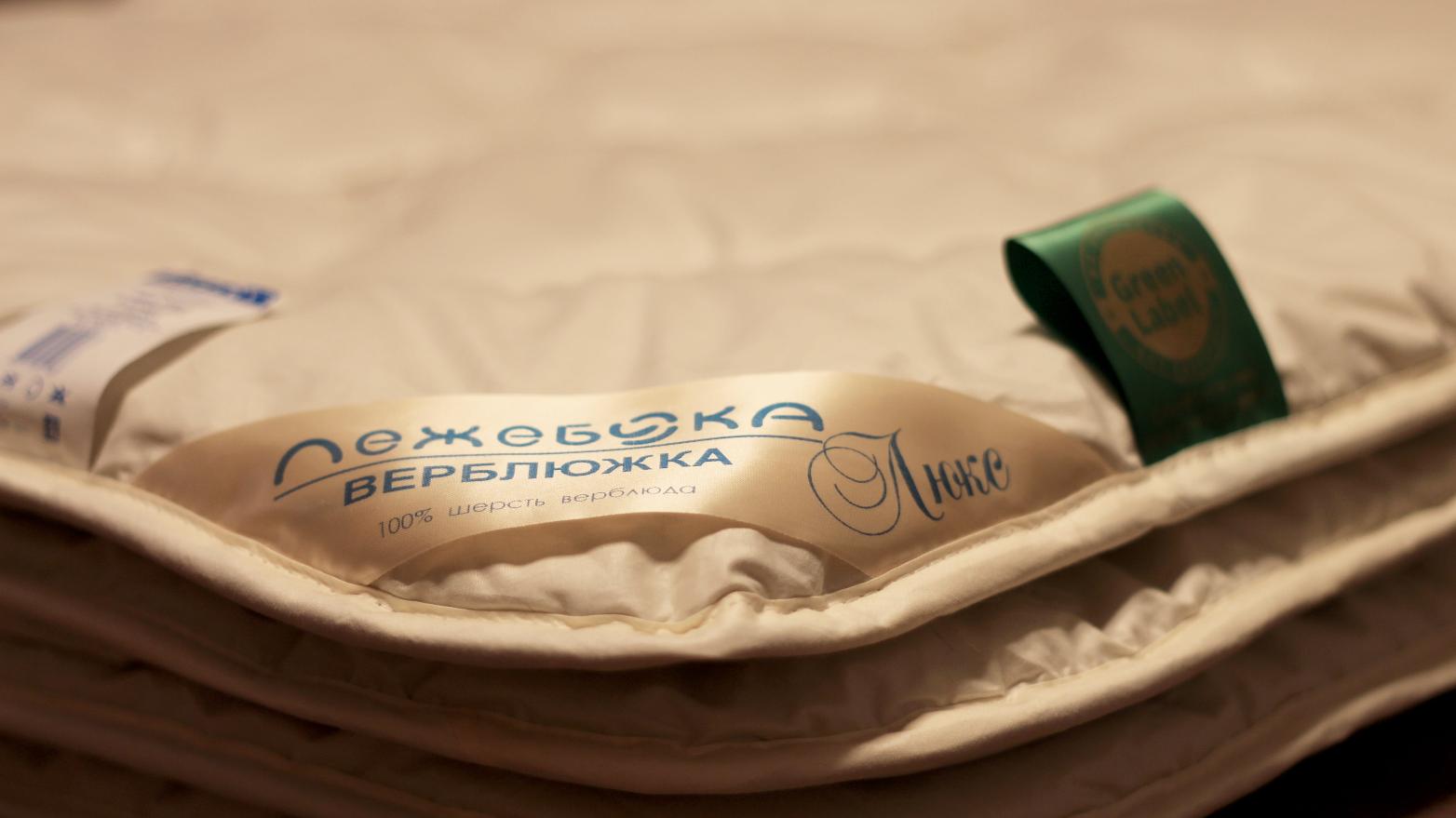 В качестве наполнителя для производства одеяла "Верблюжка Люкс" российской торговой марки "Лежебока" используется термоскреплённая верблюжья шерсть. Верблюжья шерсть содержит природный животный воск (ланолин), который при температуре человеческого тела впитывается через кожу, оказывая благотворное воздействие на мышцы и суставы. Полая структура волокон обеспечивает верблюжьему одеялу высокую теплоизоляцию, лёгкость и гигроскопичность. В одеяле есть смотровое окно на молнии под угловой лентой. Ткань чехла - 100% хлопок тик
