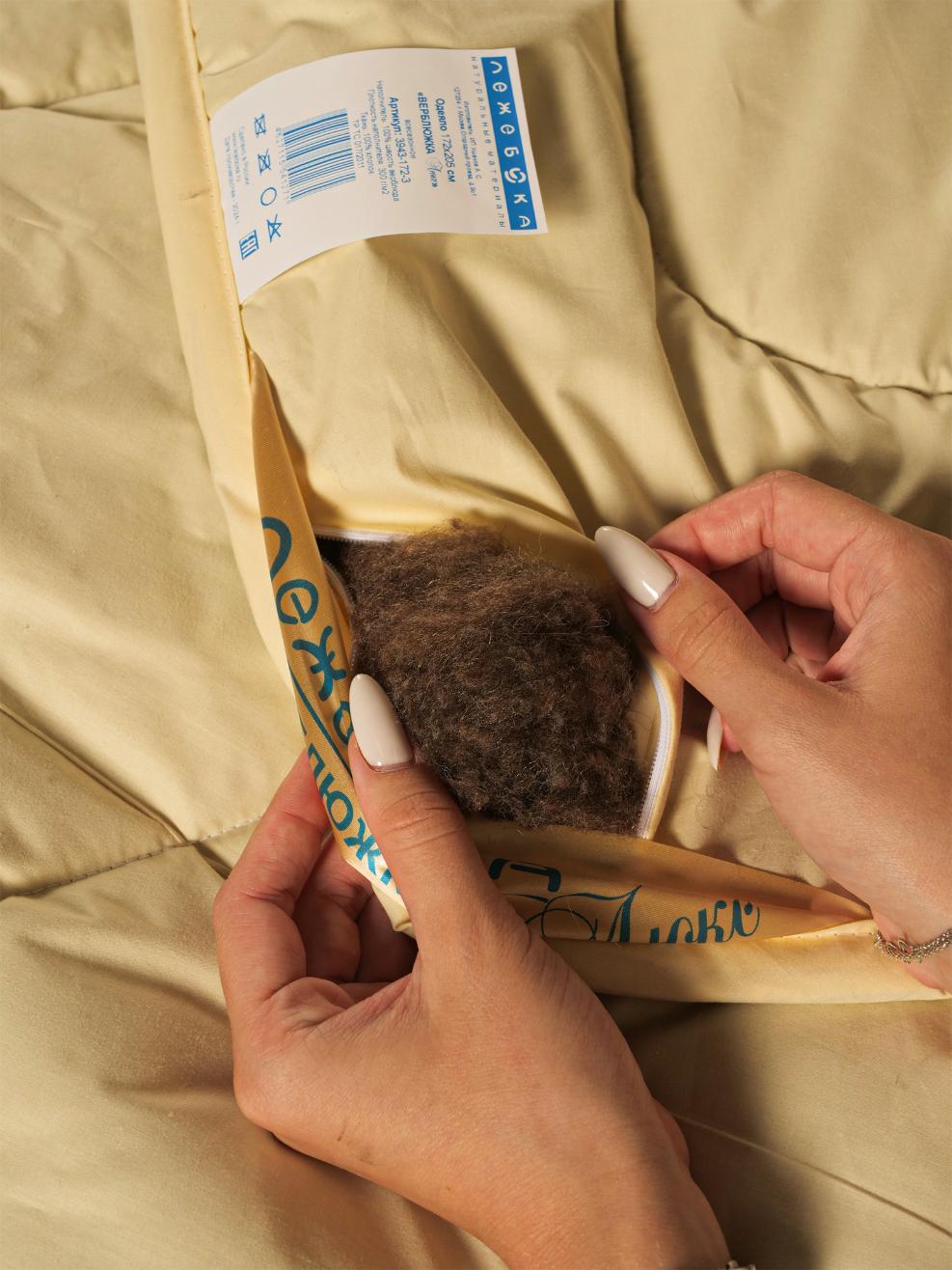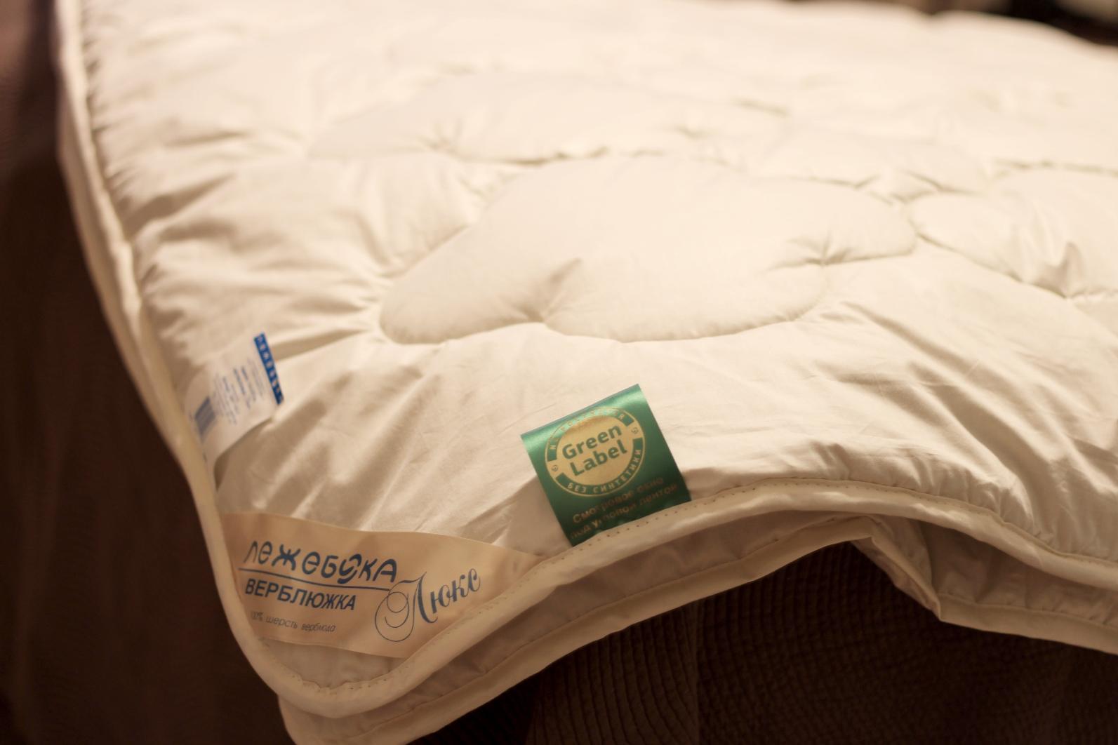 В качестве наполнителя для производства одеяла "Верблюжка Люкс" российской торговой марки "Лежебока" используется термоскреплённая верблюжья шерсть. Верблюжья шерсть содержит природный животный воск (ланолин), который при температуре человеческого тела впитывается через кожу, оказывая благотворное воздействие на мышцы и суставы. Полая структура волокон обеспечивает верблюжьему одеялу высокую теплоизоляцию, лёгкость и гигроскопичность. В одеяле есть смотровое окно на молнии под угловой лентой. Ткань чехла - 100% хлопок тик