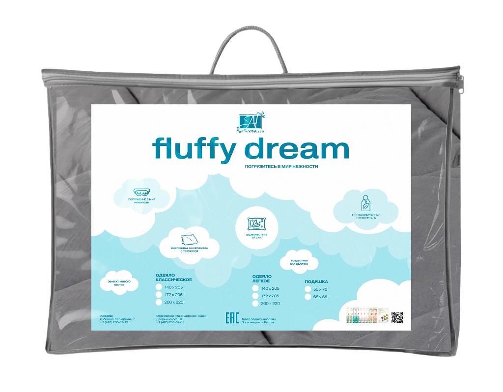 В качестве наполнителя для одеяла «FLUFFY DREAM» используется искусственный лебяжий пух — сверхтонкое полое силиконизированное волокно, спиралевидные пружины которого обладают способностью сжиматься и разжиматься, что обеспечивает правильную микроциркуляцию воздуха во время сна, позволяет изделию быстро восстанавливать форму и сохранять свою функциональность в течение длительного времени. Особо надо отметить гипоаллергенные свойства такого наполнителя, в нём не разводятся клещи и бактерии. Ткань чехла выполнена из умягчённой микрофибры и с текстурой мягкого шелка «BRUSH EFFECT». Отделка - атласный кант.
