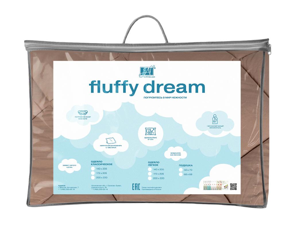 В качестве наполнителя для одеяла «FLUFFY DREAM» используется искусственный лебяжий пух — сверхтонкое полое силиконизированное волокно, спиралевидные пружины которого обладают способностью сжиматься и разжиматься, что обеспечивает правильную микроциркуляцию воздуха во время сна, позволяет изделию быстро восстанавливать форму и сохранять свою функциональность в течение длительного времени. Особо надо отметить гипоаллергенные свойства такого наполнителя, в нём не разводятся клещи и бактерии. Ткань чехла выполнена из умягчённой микрофибры и с текстурой мягкого шелка «BRUSH EFFECT». Отделка - атласный кант.
