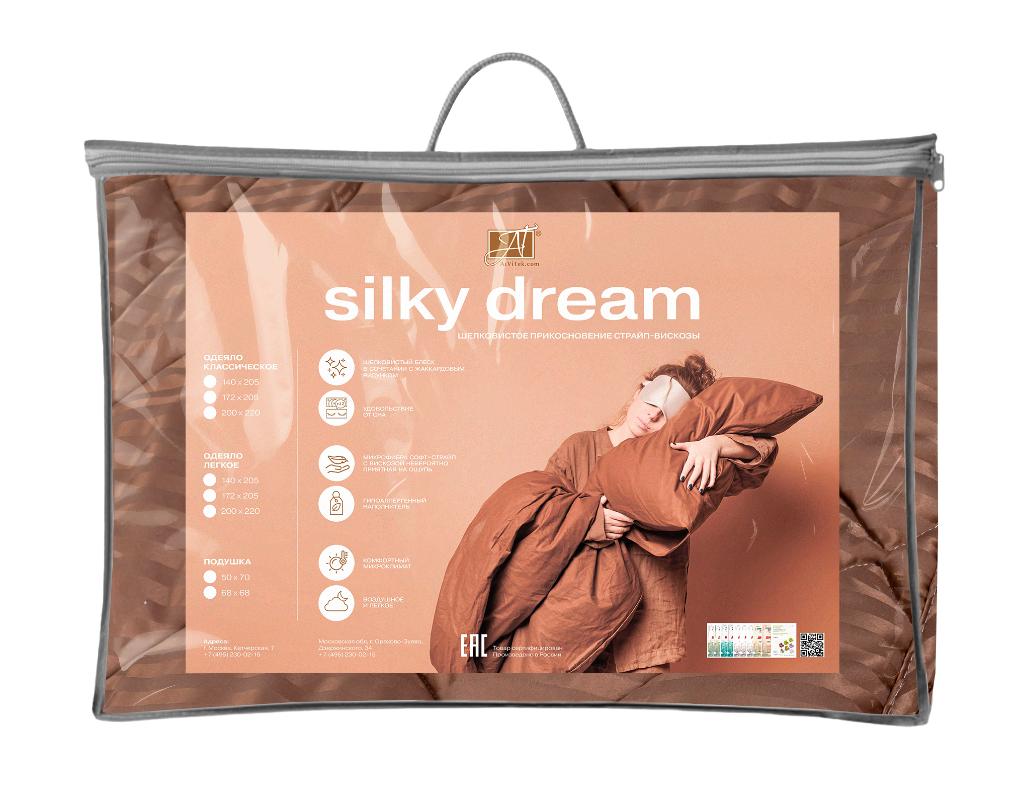 В качестве наполнителя для одеяла «SILKY DREAM» используется искусственный лебяжий пух — сверхтонкое полое силиконизированное волокно, спиралевидные пружины которого обладают способностью сжиматься и разжиматься, что обеспечивает правильную микроциркуляцию воздуха во время сна, позволяет изделию быстро восстанавливать форму и сохранять свою функциональность в течение длительного времени. Особо надо отметить гипоаллергенные свойства такого наполнителя, в нём не разводятся клещи и бактерии. Ткань чехла выполнена из микрофибры Софт-Страйп с вискозой. Особенность данной коллекции - жаккардовый рисунок ткани в сочетании с шелковистым блеском.