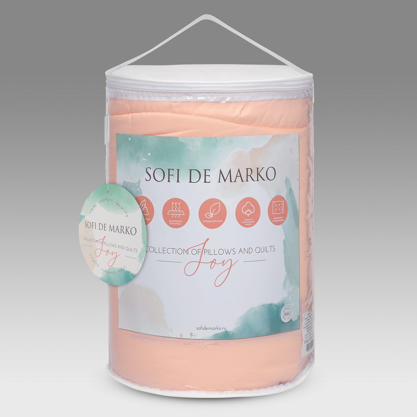 Одеяло JOY торговой марки "Sofi de Marko" выполнено в чехле из сатина с наполнителем из шёлка и искусственного лебяжьего пуха, спиралевидные пружины которого обладают способностью сжиматься и разжиматься, что обеспечивает правильную микроциркуляцию воздуха во время сна, позволяет изделию быстро восстанавливать форму и сохранять свою функциональность в течение длительного времени.