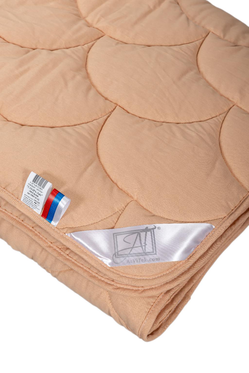 Одеяло «САХАРА-Лайт» с наполнителем из верблюжьей шерсти содержит природный животный воск (ланолин), который при температуре человеческого тела впитывается через кожу, оказывая оздоравливающее воздействие на мышцы и суставы. Полая структура волокон обеспечивает верблюжьему одеялу высокую теплоизоляцию, лёгкость и гигроскопичность. Ткань чехла выполнена из поплина (100% хлопок).