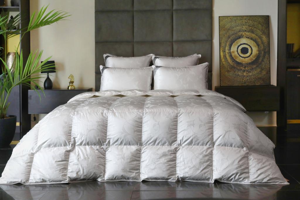 Для производства кассетного одеяла серии "Monferrat" ТМ "Primavelle" в качестве наполнителя используется 100% белый пух гусей мазурийской породы категории Экстра с показателем упругости Fill Power не менее 900 единиц, что обеспечивает изделию объёмность и способность сохранять тепло в течение длительного времени. Ткань чехла - жаккард (35% шёлк, 65% хлопок)