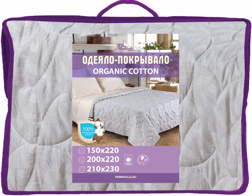 При пошиве лёгкого одеяла-покрывала серии "Organic Cotton" торговой марки "Primavelle" в качестве ткани чехла используется двуслойный жаккард (100% органический хлопок). Наполнитель: 80% хлопок, 20% полиэфирное волокно.