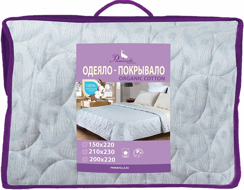 При пошиве лёгкого одеяла-покрывала серии "Organic Cotton" торговой марки "Primavelle" в качестве ткани чехла используется двуслойный жаккард (100% органический хлопок). Наполнитель: 80% хлопок, 20% полиэфирное волокно.