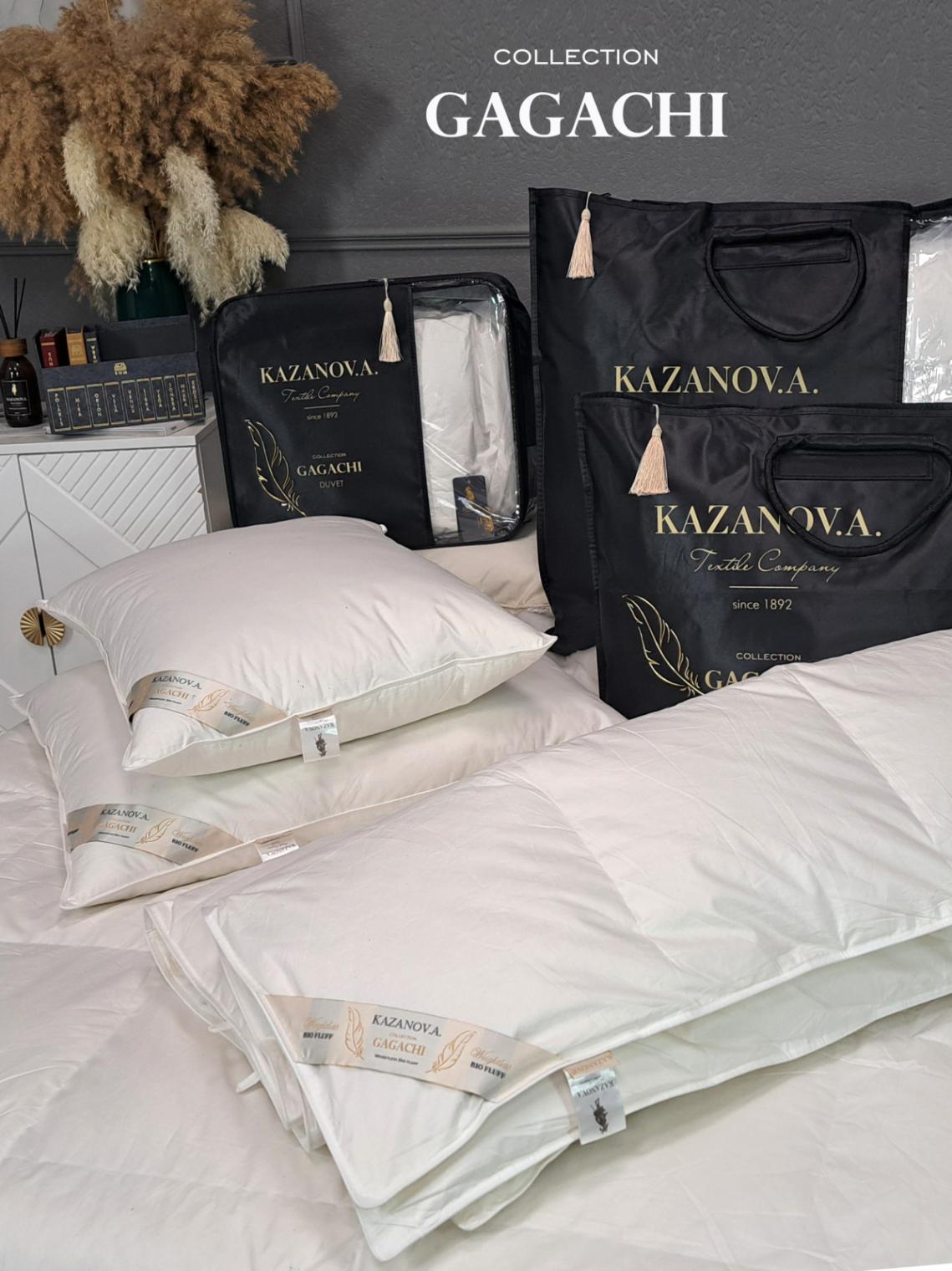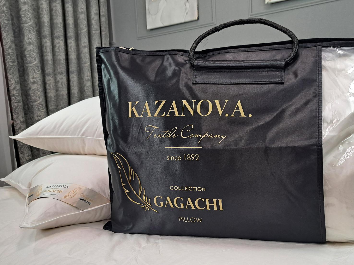 В качестве материала для ткани чехла подушек и одеял серии GAGACHI торговой марки "Kazanov.A" используется 100% хлопок. Наполнитель – инновационное волокно пух Гагачи – представляет собой смесь пушинок и отборных микро-перышек, максимально приближенную к свойствам натуральной пухо-перовой смеси. Подушки обладают прекрасными анатомическими свойствами, мягко разгружая и поддерживая шею во время сна. Одеяла GAGACHI отличаются равномерным распределением наполнителя: тепло ощущается мягким, без перегрева и лишней тяжести. Изделия остаются пышными и легкими на протяжении всего срока службы.