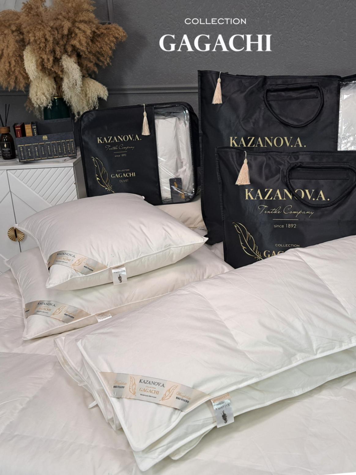 В качестве материала для ткани чехла подушек и одеял серии GAGACHI торговой марки "Kazanov.A" используется 100% хлопок. Наполнитель – инновационное волокно пух Гагачи – представляет собой смесь пушинок и отборных микро-перышек, максимально приближенную к свойствам натуральной пухо-перовой смеси. Подушки обладают прекрасными анатомическими свойствами, мягко разгружая и поддерживая шею во время сна. Одеяла GAGACHI отличаются равномерным распределением наполнителя: тепло ощущается мягким, без перегрева и лишней тяжести. Изделия остаются пышными и легкими на протяжении всего срока службы.