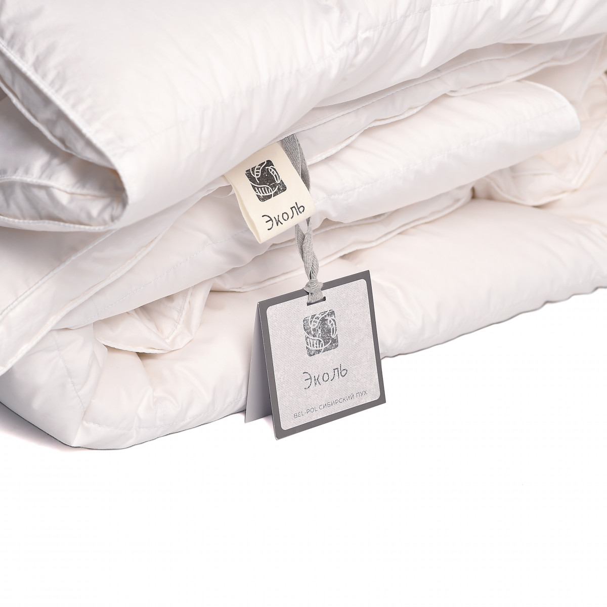 Одеяло пуховое с бортом «Эколь NORD» премиальной серии ТМ "Бел-Поль" выполнено в чехле из батиста (100% хлопок) с наполнителем из белого сибирского пуха класса Экстра (98% пух, 2% гусиное перо).