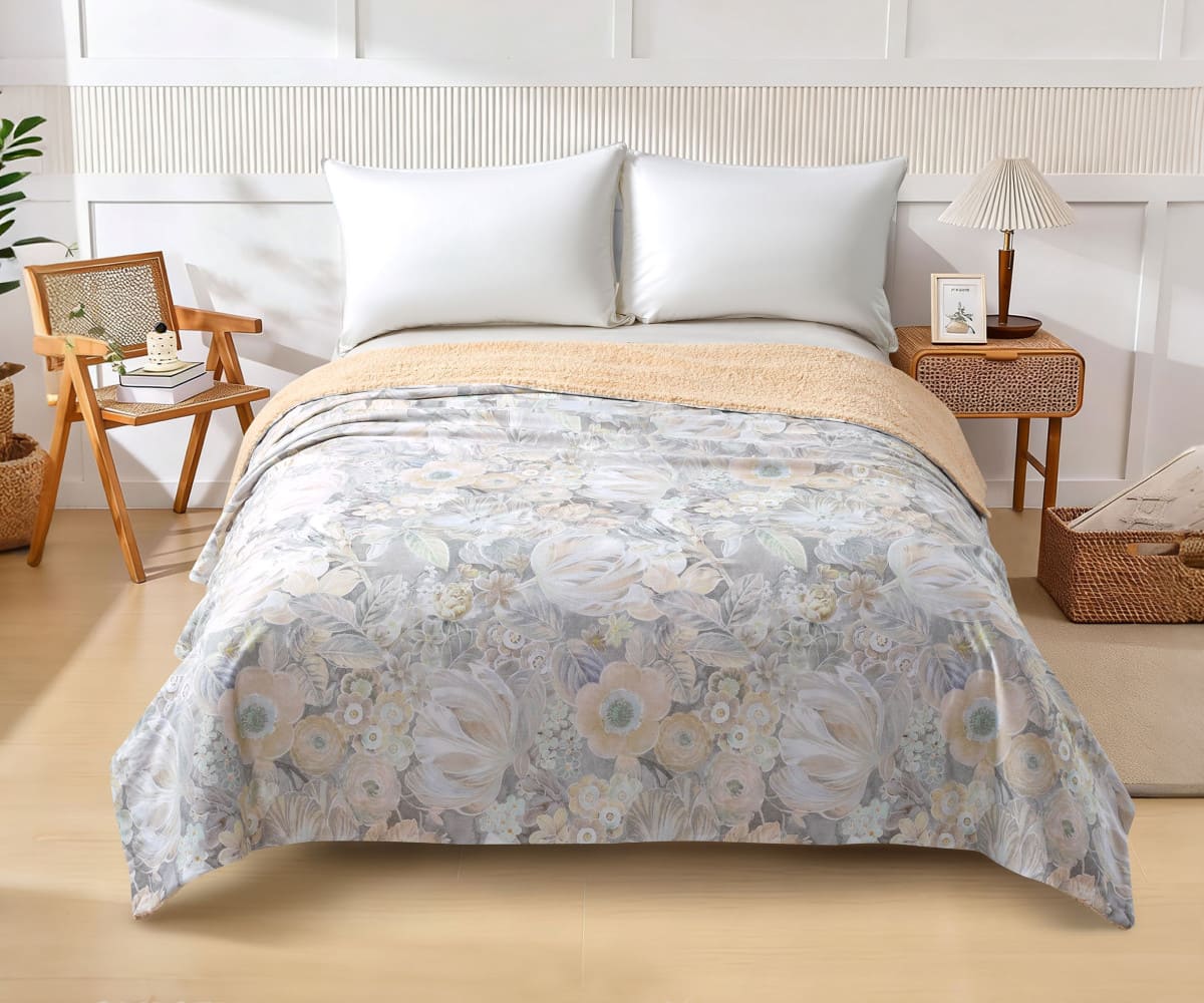 Наружная сторона одеяла серии "SHF" выполнена из 100% хлопка. Оборотная сторона - шерпа, представляющая собой искусственный материал на основе волокон полиэстера, имитирующий искусственный мех.