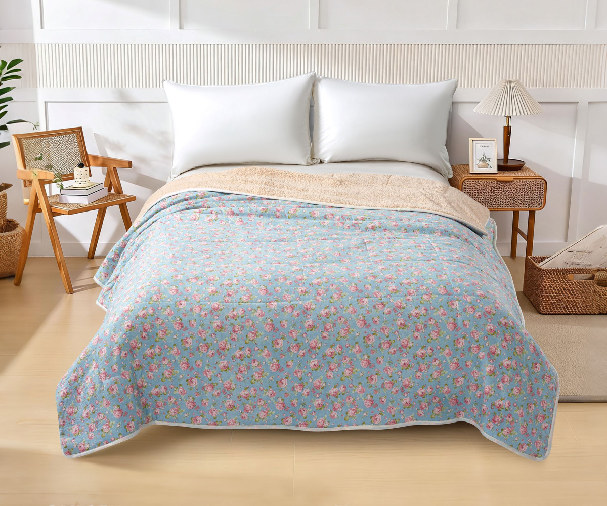 Наружная сторона стеганого одеяла серии "SH" выполнена из 100% полиэстера. Оборотная сторона - шерпа, представляющая собой искусственный материал на основе волокон полиэстера, имитирующий искусственный мех.