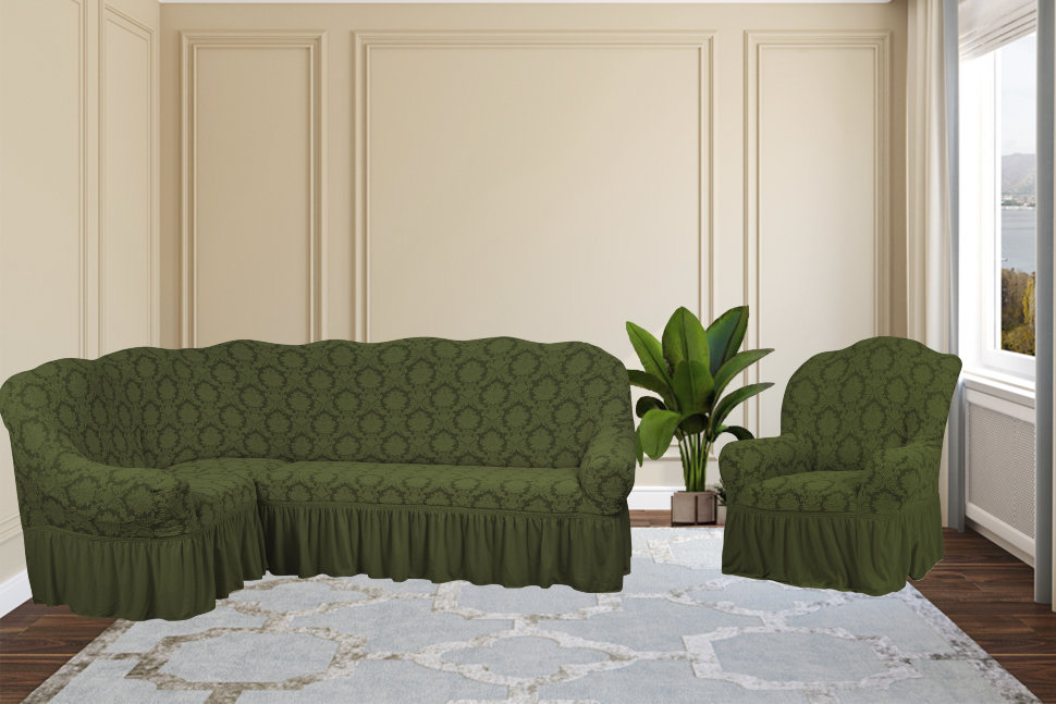 Комплект чехлов на 3-х местный угловой диван и кресло с оборкой Karteks "Классика" KAR 003-09, зелёный