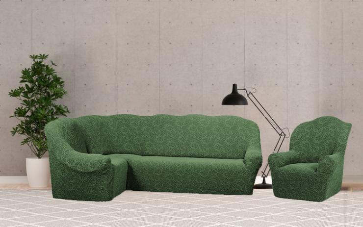 Комплект чехлов на 3-х местный угловой диван и кресло Karteks "Классика" с оборкой KAR 008-09, зелёный