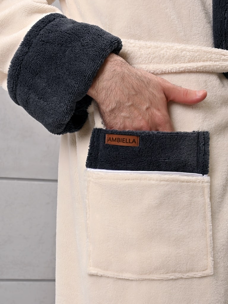 При изготовлении мужского халата данной серии торговой марки "Ambiella" используется ткань, выполненная по технологии трига-бамбук: