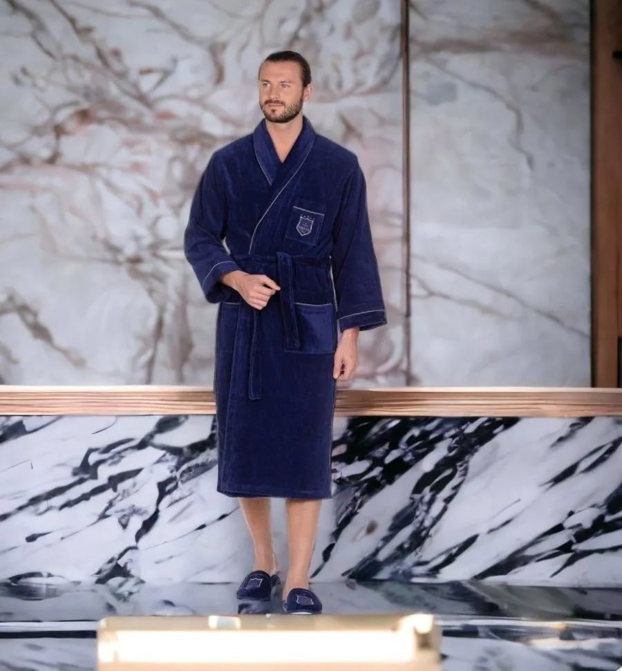При пошиве мужского халата серии "BOSWELL" используется двусторонняя ткань на хлопковой основе, что обеспечивает изделию экологичность, гипоаллергенность, оптимальное сочетание мягкости и прочности, гигроскопичности и воздухопроницаемости.