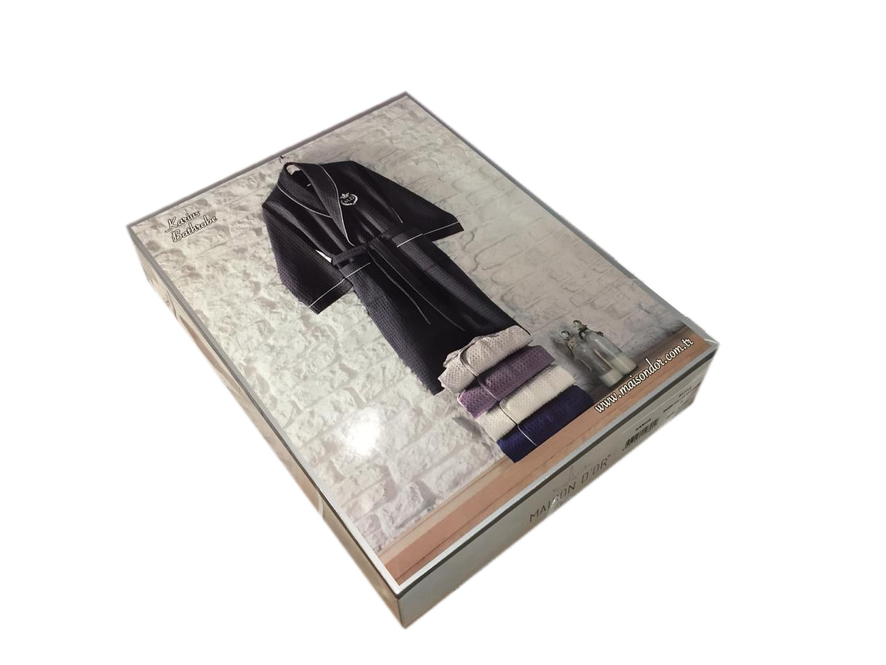 При изготовлении халата серии "KARIUS" торговой марки "Maison D'or" используется вафельная ткань на основе волокон хлопка, что обеспечивает изделию экологичность, гипоаллергенность, оптимальное сочетание мягкости и прочности, гигроскопичности и воздухопроницаемости.