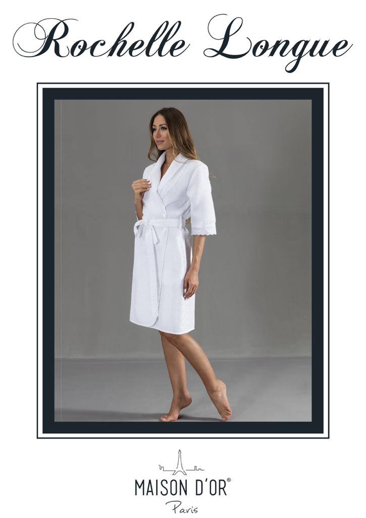 При изготовлении халата серии "ROCHELLA" торговой марки "Maison D'or" используется вафельная ткань на основе волокон хлопка, что обеспечивает изделию экологичность, гипоаллергенность, оптимальное сочетание мягкости и прочности, гигроскопичности и воздухопроницаемости.